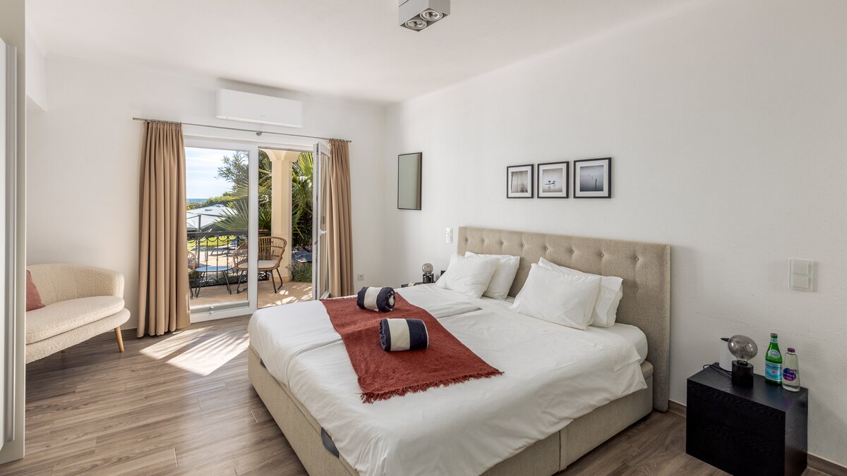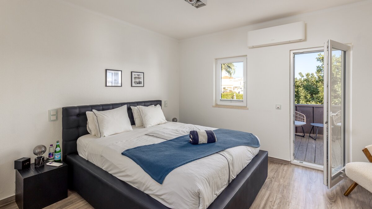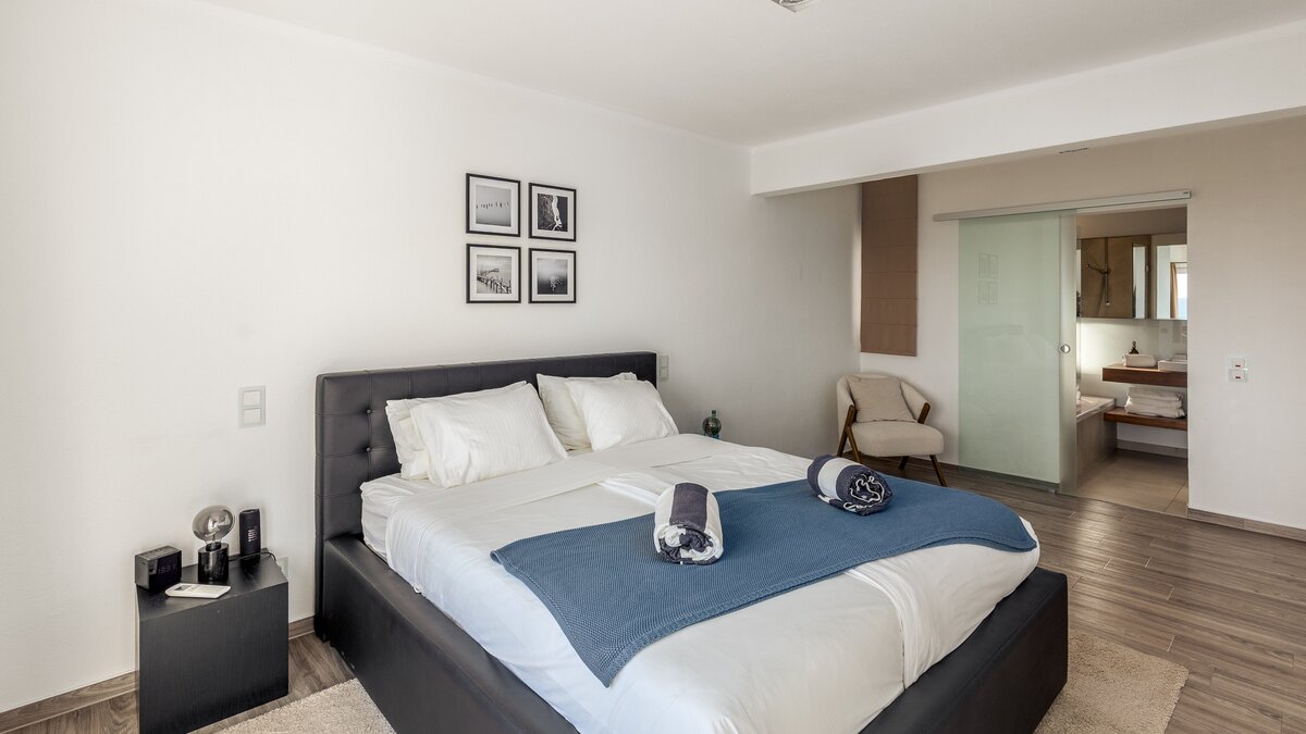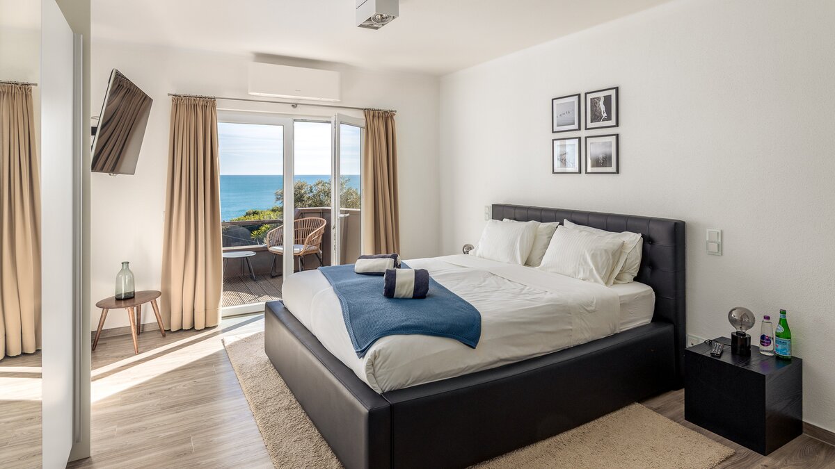 Im Obergeschoss befinden sich drei elegante Schlafzimmer, von denen jedes einen Panoramablick auf den Atlantik bietet. Besonders besonders ist die Master-Suite mit einem privaten Balkon ausgestattet, der sich perfekt für einen ruhigen Morgenkaffee oder den Sonnenuntergang eignet. Jedes Zimmer ist mit weicher Bettwäsche und stilvollem Dekor ausgestattet, während zwei Schlafzimmer mit eigenem Bad ausgestattet sind, das nach höchsten Standards ausgestattet ist.