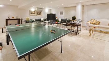Im Untergeschoss befinden sich zwei weitere Doppelschlafzimmer mit Dusche en suite und ein Zweibettschlafzimmer. Ein Fitnessraum und ein Spielzimmer mit Barbereich, TV, Tischtennis und Billardtisch sind ebenfalls vorhanden.