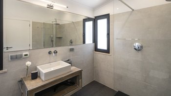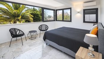 Die Villa Dulce verbindet auf wunderschöne Weise Eleganz mit Funktionalität in ihren weitläufigen Wohnräumen. Deren untere Bereich ist ein Beweis für anspruchsvolles Design und verfügt über ein geräumiges Wohnzimmer mit bequemen Sitzgelegenheiten und modernem Dekor. Große Fenster tauchen den Raum in natürliches Licht und bieten einen malerischen Blick auf den Garten. An diesen einladenden Raum grenzt eine offene Küche an, die komplett mit modernsten Geräten und großzügigen Arbeitsflächen ausgestattet ist. Der Essbereich mit Blick auf den Garten bietet einen perfekten Rahmen für Abendessen in intimer Atmosphäre oder unterhaltsame Gäste. Auf dieser Ebene bieten drei Doppelschlafzimmer Komfort und Privatsphäre. Ein Schlafzimmer verfügt über ein eigenes Duschbad, während sich die anderen beiden ein stilvolles Duschbad teilen, was die Villa zu einer idealen Wahl für Familien mit mehreren Generationen macht.