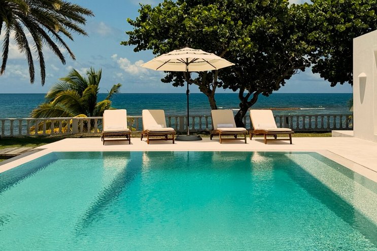 Diese charmante Villa am Meer mit vier Schlafzimmern bietet einen Panoramablick auf das Karibische Meer bis zum Horizont und den Ffryes Strand darunter.