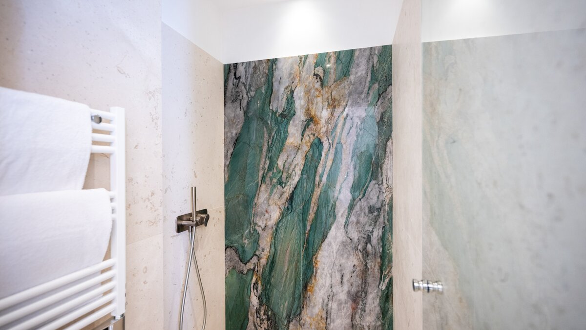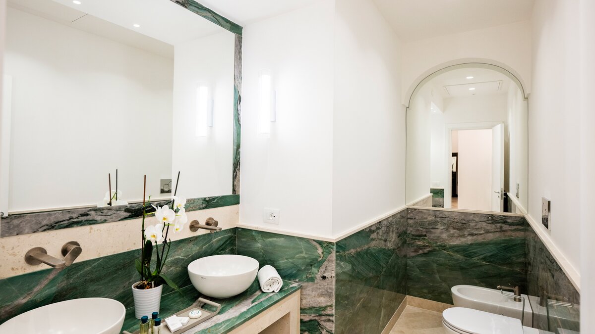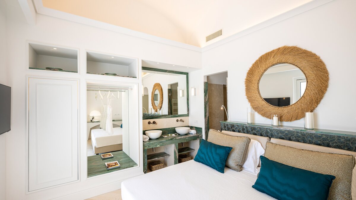 Auf der anderen Seite der Terrasse ist die Unterkunft geschickt in zwei separate Schlafzimmer-Suiten unterteilt, die Flexibilität und Privatsphäre bieten. Jedes Schlafzimmer verfügt über ein Super-Kingsize-Bett, Waschbecken im Zimmer, Fernseher und eine eigene Dusche, was die Aufteilung besonders für zwei Paare attraktiv macht, die zusammen reisen. Eine gemeinsame Garderobe mit WC und Bidet sorgt für zusätzlichen Komfort.