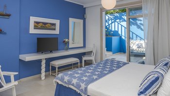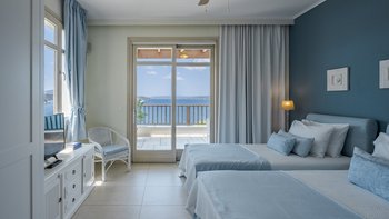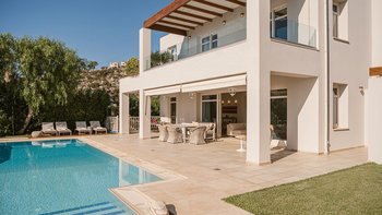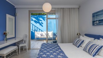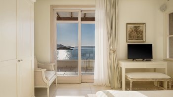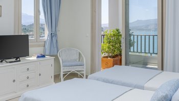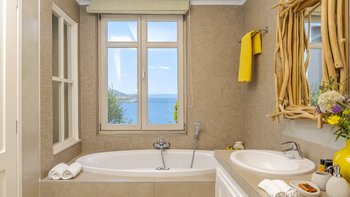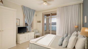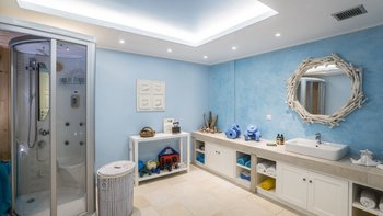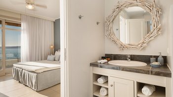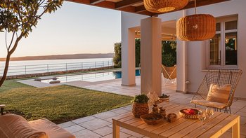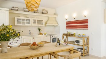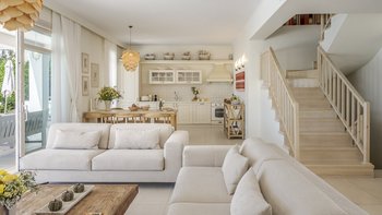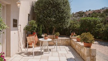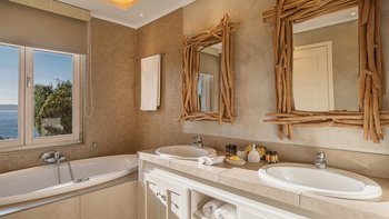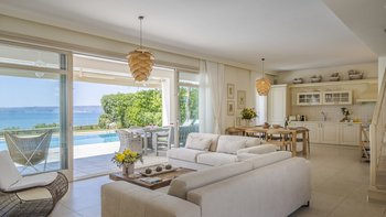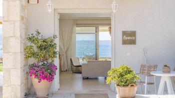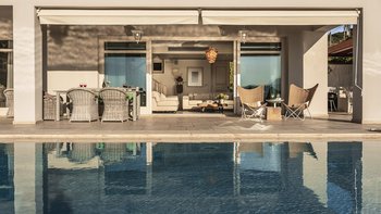 Diese weiß getünchte Villa, eine der drei benachbarten Schwestervillen, ist im Salzwasser-Stil eines luftigen Strandhauses eingerichtet, das mit sorgfältig ausgewählten Artefakten bestreut ist, um das Küstenmotiv zu ergänzen. Draußen, am großen und schönen Pool, sitzen einfache Liegestühle Seite an Seite mit stilvollen Sonnenliegen und genießen einen ruhigen Blick auf die Bucht von Souda. Denen von jungen Palmen gesäumten und natürlich von Grünes abgeschirmten Gärten bieten eine ruhige Privatsphäre für ein „Wohnzimmer“ im Freien unter einem Pavillon. Eine überdachte Terrasse am Pool führt in den geräumigen Wohnbereich der Villa, der mit WLAN, Satellitenfernsehen und einer Musikanlage im ganzen Haus ausgestattet ist.