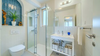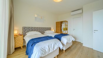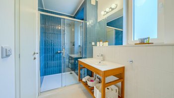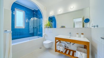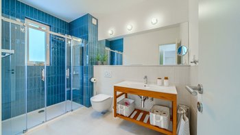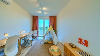 Wenn Sie in die oberen Ebenen hinaufsteigen, entdecken Sie vier Schlafzimmer mit eigenem Bad, die jeweils für bis zu acht Erwachsene Privatsphäre und Ruhe bieten. Zu den durchdachten Details gehören ein spezieller Büroraum für diejenigen, die aus der Ferne arbeiten möchten, eine Kinderecke für die jüngeren Gäste und ein gut ausgestattetes Fitnessstudio für Fitnessbegeisterte. Dessen Aufteilung der Villa sorgt dafür, dass jeder Gast sowohl Gemeinschaftsräume und auch private Rückzugsorte genießt, was sie ideal für Familien oder Gruppen von Freunden macht.