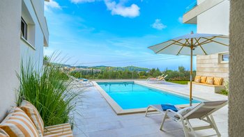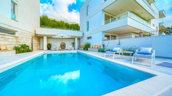 Der beheizte Pool, der von bequemen Liegestühlen und stilvollen Loungemöbeln umgeben ist, ist ideal, um die mediterrane Sonne zu genießen oder mit Familie und Freunden zu entspannen. Ein einladender Essbereich im Freien befindet sich nur wenige Schritte vom Pool entfernt, ideal für unvergessliche Mahlzeiten unter freiem Himmel, während die geräumige Poolterrasse einen Panoramablick auf das Meer und eine ruhige Atmosphäre bietet.