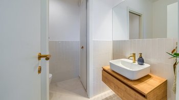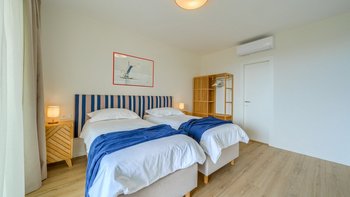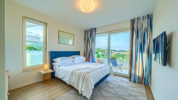 Im Erdgeschoss werden die Gäste in einem hellen und luftigen Wohnbereich willkommen geheißen, wo die Panoramafenster einen weiten Blick rahmen und den Innenraum mit natürlichem Licht durchfluten. Der offene Grundriss der Küche und der Essbereich, der durchdacht für gesellige Zusammenkünfte gestaltet wurde, öffnen sich direkt auf eine geräumige Poolterrasse, die sich perfekt für Mahlzeiten im Freien und gemütliche Nachmittage am Wasser eignet.