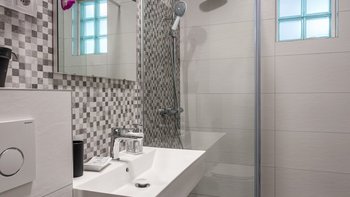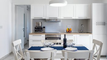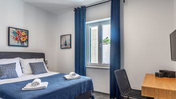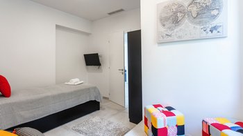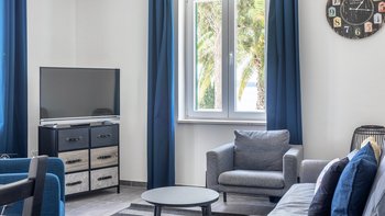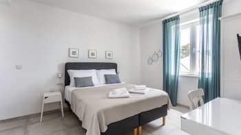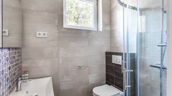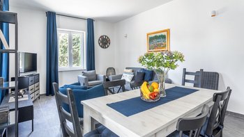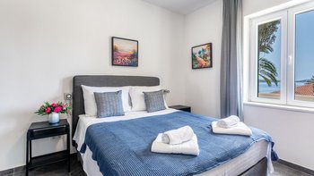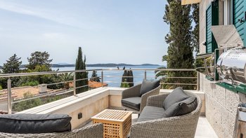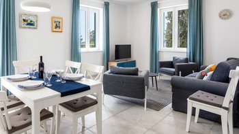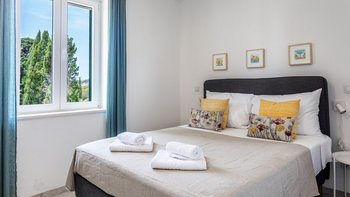 Auf der ersten Etage können die Gäste noch mehr Privatsphäre genießen, mit einem zweiten Wohnzimmer und einer Küche, was die Villa besonders für mehrere Familien oder größere Gruppen geeignet macht. Denen drei Schlafzimmer im Obergeschoss sind geschmackvoll eingerichtet und bieten ruhige Räume, um sich nach einem ereignisreichen Tag zu entspannen. Jedes Zimmer ist mit Komfort im Hinterkopf gestaltet, und die zusätzlichen Bäder sind ein zusätzlicher Bonus. Große Fenster und Balkone auf dieser Ebene bieten einen Panoramablick auf die Adria und die umliegende Landschaft und schaffen eine ruhige Atmosphäre im gesamten Gebäude.