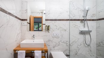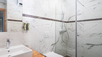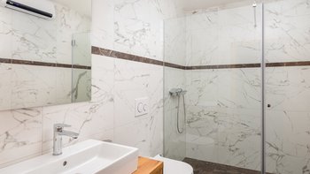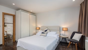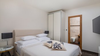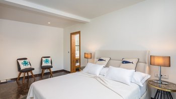 Die Unterkunft ist auf zwei Etagen Split. Im Erdgeschoss befinden sich eine kompakte und moderne Küche und ein Esszimmer im Innenbereich sowie ein komfortabler Wohnbereich, die alle in eleganten Grautönen mit kühlen Marmorböden unter den Füßen gehalten sind.Es gibt fünf fabelhafte Schlafzimmer auf zwei Etagen, die alle entweder eine Dusche oder ein Bad en suite haben. Dessen beste Schlafzimmer des Hauses befindet sich im ersten Stock mit raumhohen Fenstern mit Blick auf das Meer.