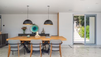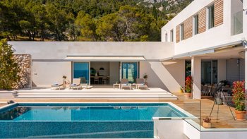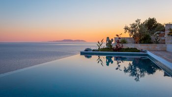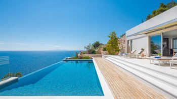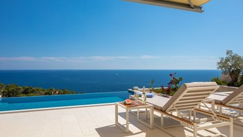 Es ist unbestreitbar, dass die Villa Orchid eine herausragende Villa ist. Einzigartig in ihrem Design vor einer Kaskade von Terrakotta-Dächern, ist Orchid übermodern und ein Blickfang, mit Panoramafenstern und einer fabelhaften Terrasse, die das Epizentrum dieser Villa bildet. Direkt neben dem Haus befindet sich ein Essbereich im Freien, der für den Komfort der Gäste schattig ist. Holzterrassen erstrecken sich über die gesamte Breite der Terrasse unter einem bequemen Sitzbereich und einer Reihe von Liegestühlen, auf denen man die Sonne genießen kann. Dessen besonderes Highlight ist ein herrlicher beheizter Infinity-Pool, der die Linien zwischen dem Wasserrand und dem saphirblauen Meer dahinter verwischt und ein perfekter Ort und Ort, um den puderrosafarbenen Himmel zu bewundern.