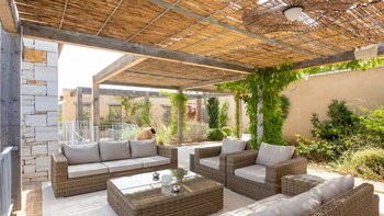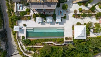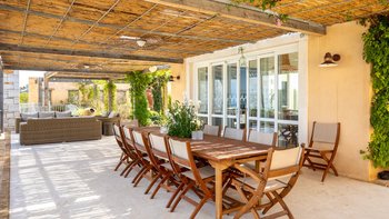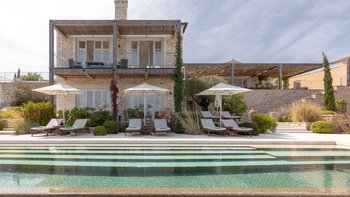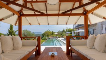 Der Wohnbereich im Freien ist der Ort, an dem Antheia wirklich zum Leben erwacht. Eine wunderschöne Terrasse verfügt über einen beeindruckenden 17 m langen Pool mit bequemen Holzliegen und einer erhöhten Pergola, die Schatten spendet, um darunter zu entspannen.