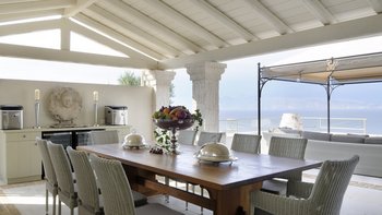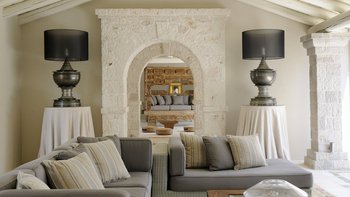 Diese luxuriöse Villa wurde hervorragend entworfen, um traditionelle korfiotische Elemente, venezianische Einflüsse der Insel und Komfort des 21. Jahrhunderts zu integrieren. Sie verfügt über geräumige Wohnbereiche auf mehreren Ebenen, drinnen und draußen, die alle von einem Gefühl von Romantik, Charakter und Stil berührt sind. Italienische Steinsäulen und Torbögen verbinden schicke Wohn- und Esszimmer mit ihren riesigen und eleganten Gegenstücken im Freien. Zwei alte Olivenbäume bilden das Herzstück eines wunderschön geformten Innenhofs, der mit einem aufwendig geschnitzten Tagesbett ausgestattet ist und vom Duft von Lavendel und dem Rinnsel des Wassers aus einer riesigen Muschel beruhigt wird.