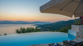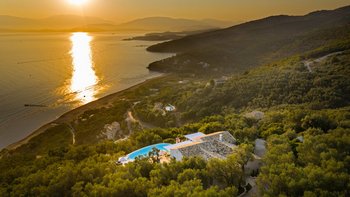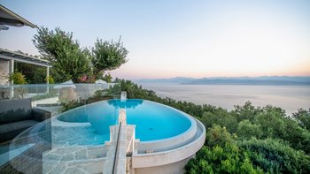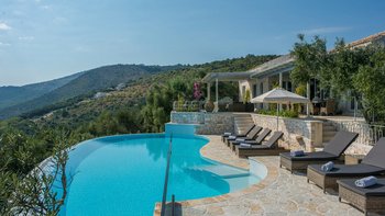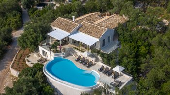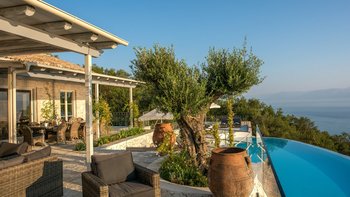 Olive Tree House bietet das Gute aus beiden Welten für Gäste, die einen wunderbar abgeschiedenen und luxuriösen Rückzugsort genießen und trotzdem nah am Geschehen sein möchten. Von seiner Hanglage aus hat man einen herrlichen Blick auf das Meer und die Berge Albaniens. Ein unwiderstehlicher nierenförmiger Pool verfügt über eine lange Infinity-Kante, wo er nahtlos mit dem Meer dahinter verschmilzt; Rattan-Liegen und Sonnenschirme säumen die gegenüberliegende Kante zum Sonnen und Stühlen auf der anderen Seite, ideal für Unterhaltung im Freien.