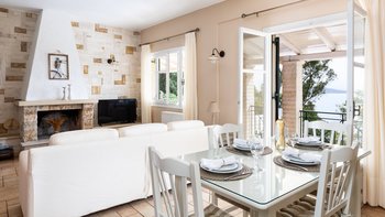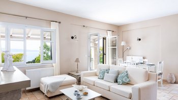 Strongilo befindet sich in einer unschlagbaren Lage mit Blick auf das Meer in der Nähe von St. Stephano. Agios Stefanos ist nur 15 Minuten zu Fuß entfernt, während Kerasia Strand nur 5 Minuten Fahrt von der Villa entfernt ist. Strongilo fühlt sich vollkommen privat, umgeben von hohen Bäumen, die den fantastischen Blick auf das Meer umrahmen. Dieser Terrakotta-Villa erstreckt sich über zwei Etagen und ist in warmen neutralen Farbtönen gehalten; das Erdgeschoss ist für einen offenen Grundriss des Wohnens mit einem komfortablen Sitzbereich, einem Innen-Esstisch, an dem man die Aussicht genießen kann, und einer gut ausgestatteten Küche; ein Zweibett-Schlafzimmer und ein Duschbad vervollständigen das Erdgeschoss.