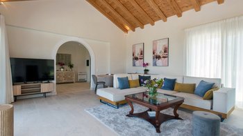 Jedes der sechs Schlafzimmer mit eigenem Bad öffnet sich entweder auf einen Balkon oder eine Terrasse, wodurch die erhöhte Lage und das natürliche Licht der Villa optimal genutzt werden. Deren Aufteilung ist ideal für Familien oder Gruppen, mit vier Doppelzimmern, darunter eine Master-Suite mit Kingsize-Bett, und zwei Zweibettzimmern. Eine offene, voll ausgestattete Küchenzeile geht in den Essbereich im Freien über und lädt die Gäste ein, entspannte Mahlzeiten im Freien zu genießen, die mit Leichtigkeit zubereitet werden.