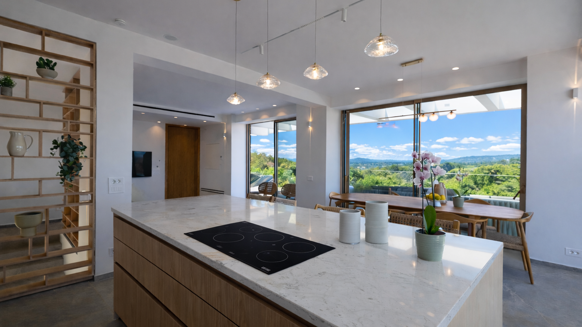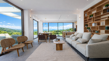 Der Hauptwohnbereich ist offen und elegant zurückhaltend, wo ein großzügiger Wohnbereich nahtlos in eine moderne Küche und einen Essbereich mit Frühstückstheke übergeht. Große Türen öffnen sich auf weitläufige Terrassen, die einen Whirlpool und eine Mischung aus sonnenverwöhnten und schattigen Sitzbereichen für entspanntes Leben im Freien offenbaren. Ein Kochbereich im Freien ist perfekt für lange, entspannte Abendessen bei Sonnenuntergang eingerichtet. Ein Lesebereich befindet sich versteckt in einer privaten Gartenecke und bietet einen ruhigeren Ort für Momente der Ruhe.