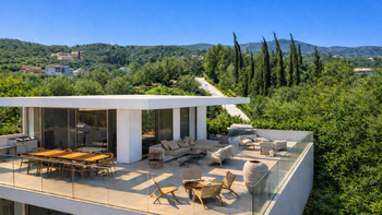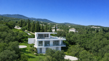 Hoch oben in den Hügeln oberhalb von Kassiopi gelegen, bietet die Villa Nessya einen atemberaubenden Blick über das Ionische Meer bis hin zu den weit entfernten albanischen Bergen. Entworfen, um das Beste aus dieser bemerkenswerten Lage zu machen, bringen riesige Glasscheiben und breite Schiebetüren Licht in jede Ecke, während sie eine sich ständig verändernde Meereslandschaft einrahmen.
