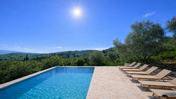 Direkt oben von der Villa befindet sich der Privater Pool in einer erhöhten Position mit Blick auf die sanften Hügel von Kassiopi, komplett mit eigener Poolbar und W / C.