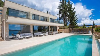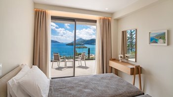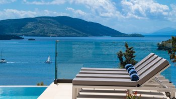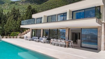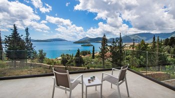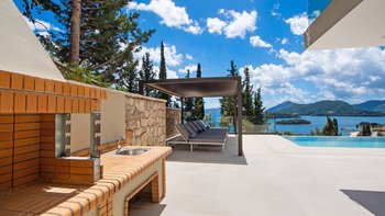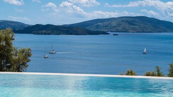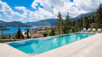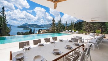 Eine stilvolle, moderne Villa hoch auf einem Hügel und in der Nähe von Nidri bietet die Villa Haido einen Panoramablick auf Lefkada und die nahe gelegenen Inseln Skorpios, Madouri und Sparti.