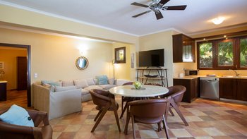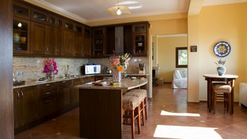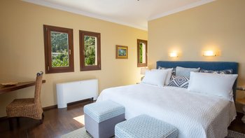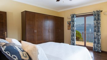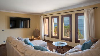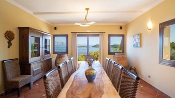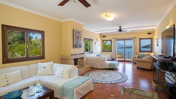 Auf einem sehr weitläufigen Privatgrundstück mit Panoramablick von etwas mehr als einem Hektar Fläche auf der grünen Halbinsel Geni gelegen, ist dieses geschätzte Familienhaus äußerst komfortabel und ein ausgezeichneter Ort für Zusammenkünfte mit der Familie oder mit Freunden. Mit Klimaanlage, allem Komfort und einem Designstil, der von gemütlich im Landhausstil bis elegant modern reicht und mit Kunstwerken aus Griechenland, Costa Rica und Japan dekoriert ist, umfasst die Unterkunft auf drei Etagen eine Gäste-Suite am Pool mit einem geräumigen Schlafzimmer mit Doppelbett und einer eigenen Küche/Wohnzimmer, die sich mit einem zweiten Schlafzimmer mit Doppelbett und eigenem Bad teilt. Die drei weiteren geräumigen Schlafzimmer, die alle zu einem möblierten Balkon führen, teilen sich die oberste Etage mit einem weiteren attraktiven Wohnzimmer, das wie ein Aussichtsturm wirkt und komplett mit Teleskop ausgestattet ist. Dazwischen, im Erdgeschoss, befinden sich eine gut ausgestattete große Frühstücksküche, ein luftiges Esszimmer mit einem Massivholz-Refektoriumstisch für zehn Personen und große Sofas und Sitzsäcke und großer Fernseher in einem ungezwungenen Wohnzimmer.
