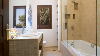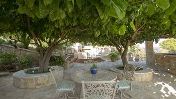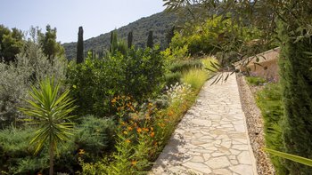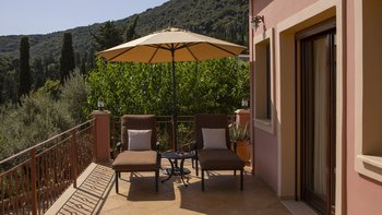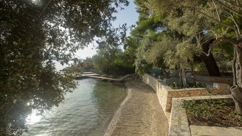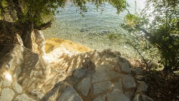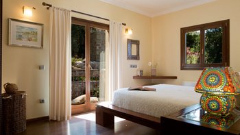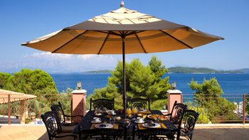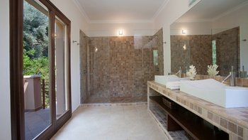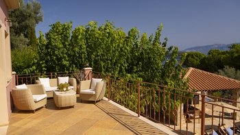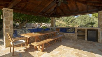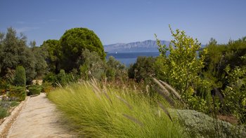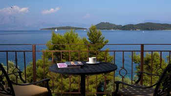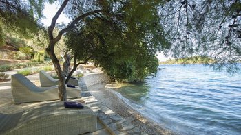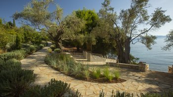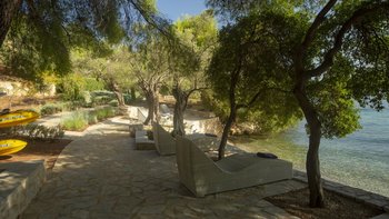 Alle drei Zimmer auf dieser Ebene öffnen sich zu einer langen Veranda, die zum Essen im Freien eingerichtet ist und über das Wasser hinaus zur Skorpios-Insel blickt; Treppen führen von hier zum Infinity-Pool auf der Terrasse mit Meerblick; und eine Außenküche, ideal für gemütliche Mittagessen, verfügt über einen Holzofen, einen Grill und einen Vorbereitungsbereich. Es gibt auch einen schattigen Essbereich auf dieser Ebene neben dem Außenküchenbereich und Tischtennis auf der Rückseite des Anwesens. Wege schlängeln sich durch die schönen reifen, abgestuften Gärten zu einem Bereich, der mit Sonnenliegen zum Entspannen am Wasser ausgestattet ist, und Steintreppen führen hinunter zu den beiden Kiesstränden darunter, einer mit Steg und Bootsanlegeplatz. Deren Villa ist eine kurze Fahrt (oder Segeln) zu den Tavernen in Geni und Nidri. Bademäntel und Pflegeprodukte von Korres liegen für Sie bereit. Eines einzigartigen und besonderen Anwesen.