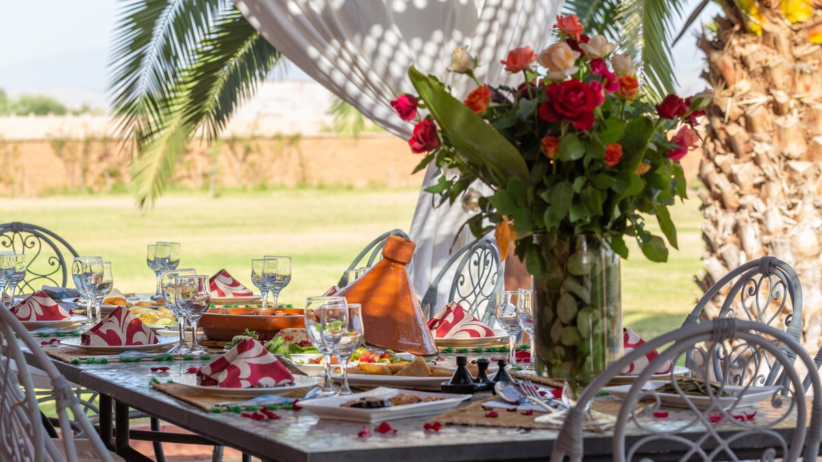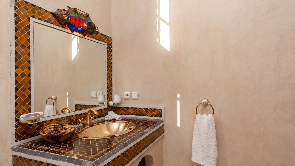 Terrakotta-Wände heben sich vor der Kulisse von üppigen grünen Gärten und dem atemberaubenden Atlasgebirge ab; Dar Jamil ist eine einladende Oase der Ruhe und bietet den Gästen den perfekten Rahmen, um sich vollkommen zu entspannen und zu entspannen. Dieser einladende Villa ist in warmen Erdtönen gehalten und mit üppigen Textilien, gemusterten Teppichen und Kissen, aufwendig handgefertigten Hängelampenschirmen und schönen LED-Badezimmern, die mit charakteristischen Zelige-Fliesen gefliest sind, dekoriert. Ein markanter zentraler Innenhof mit einem beruhigenden Wasserspiel ist ein idealer Ort für Yoga und führt zu verschiedenen Räumen. Die geräumigen Gemeinschaftsbereiche umfassen gemütliche Wohnzimmer und ein charmantes Esszimmer sowie eine voll ausgestattete Küche, in der ein hervorragender Koch alle Mahlzeiten zubereitet. Einem engagierten Hausmanager steht ebenfalls zur Verfügung, um sicherzustellen, dass die Gäste gut versorgt sind.