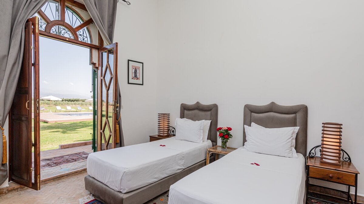 Die Aufteilung ist ideal für zwei Familien mit zwei Doppelzimmern und zwei Zweibettzimmern im Haupthaus sowie einem dritten Kinderzimmer und drei weiteren Garten-Suiten mit insgesamt 16 Schlafplätzen in drei Gebäuden. Auf der einen Seite befindet sich eine schattige Terrasse, auf der anderen Seite eine gemütliche Lounge im Freien und auf der anderen Seite ein Essbereich im Freien. Hier können die Gäste am Abend unvergessliche Sonnenuntergänge beobachten und nachts den Sternenhimmel bewundern. Inmitten der gepflegten Rasenflächen befindet sich ein beeindruckender 18 m langer Pool, von dem aus man den Blick über Hektar große Olivenhaine auf das Atlasgebirge genießen kann.