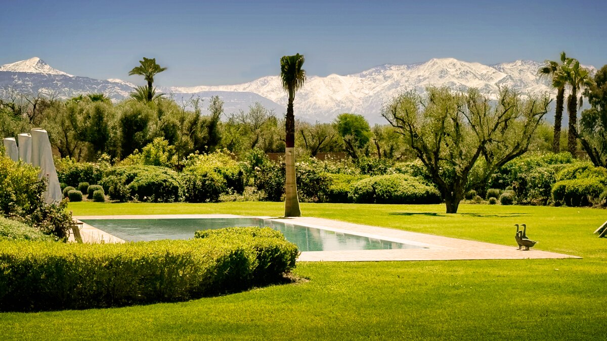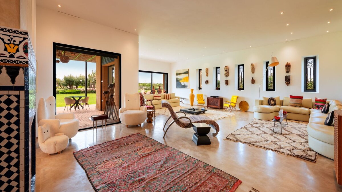 Die idyllische Villa mit fünf Schlafzimmern in Marrakesch, Marokko, beherbergt eine Vielzahl von Obst- und Olivenbäumen, neben einem Acryl-Tennisplatz, einem beheizten Pool und einer Krocket-Wiese. Mit majestätischem Blick auf das Atlasgebirge und üppigem, zeitgemäßem Interieur mit stilvollen Möbeln ist diese Villa ideal für Familien oder Gruppen von Freunden, die wahre Ruhe suchen.