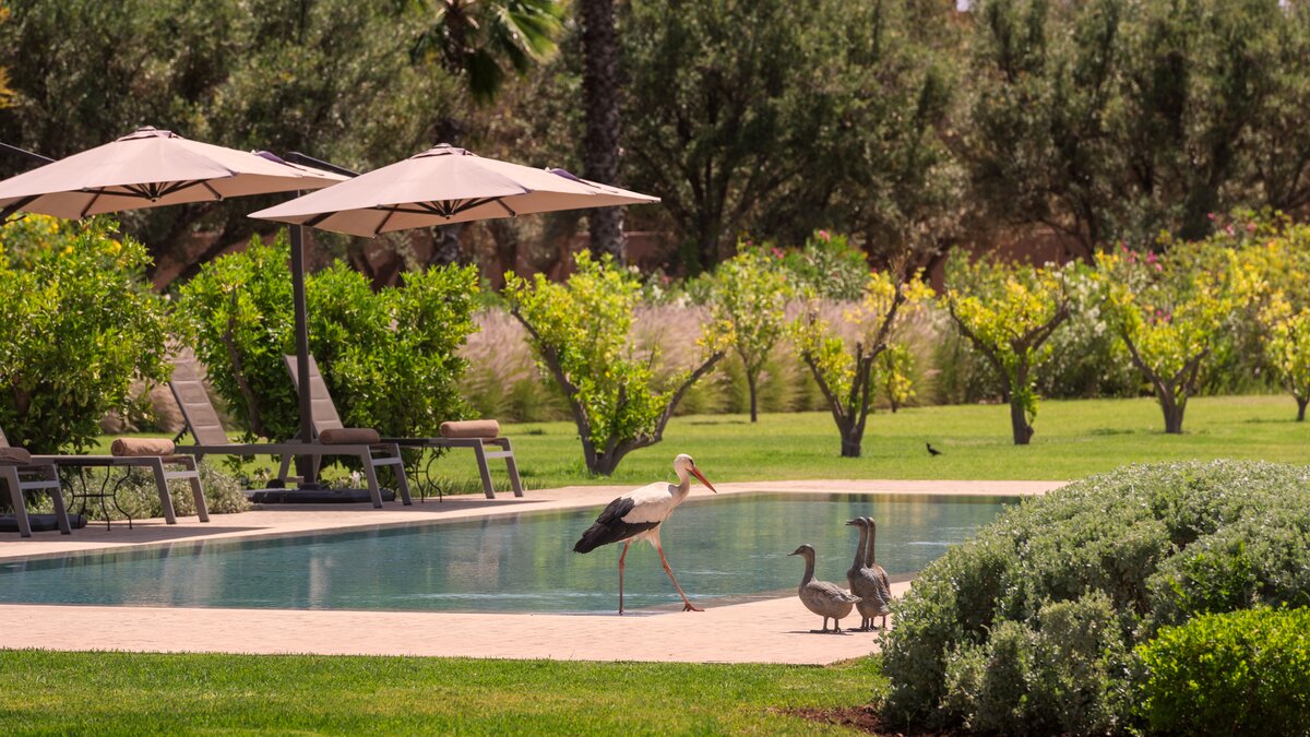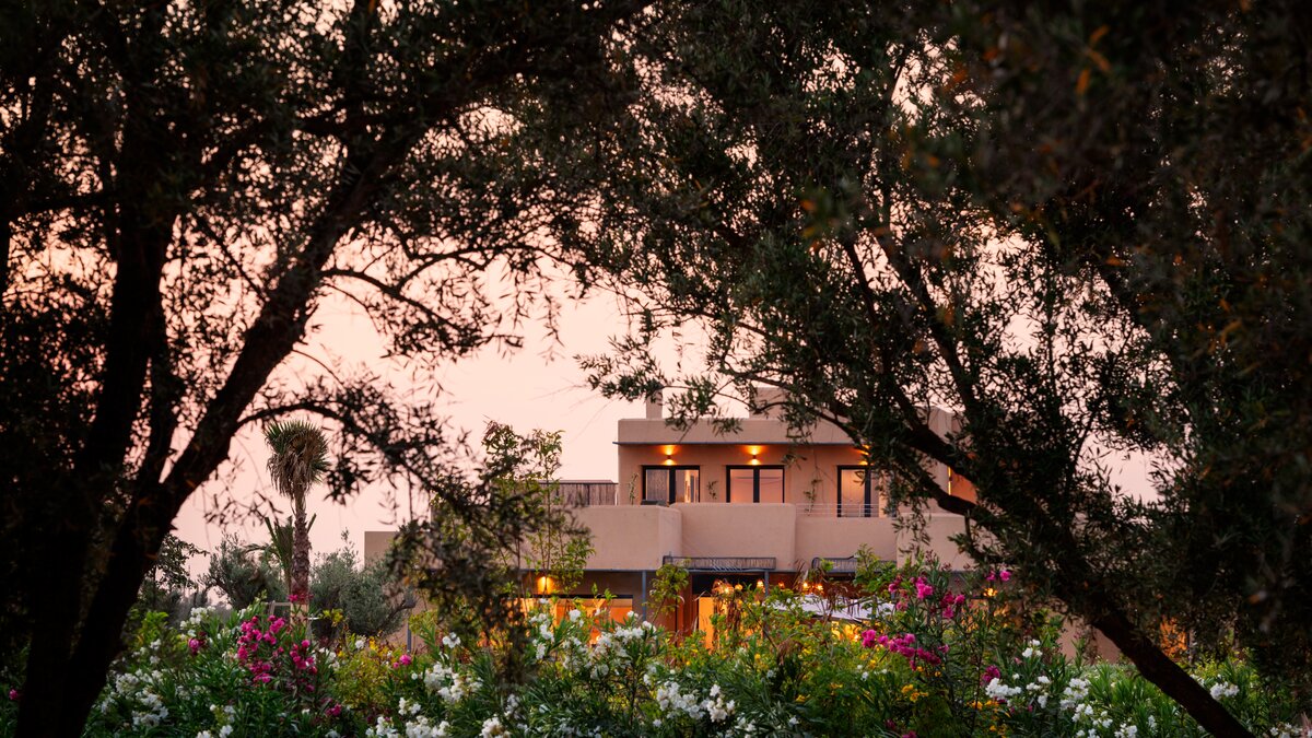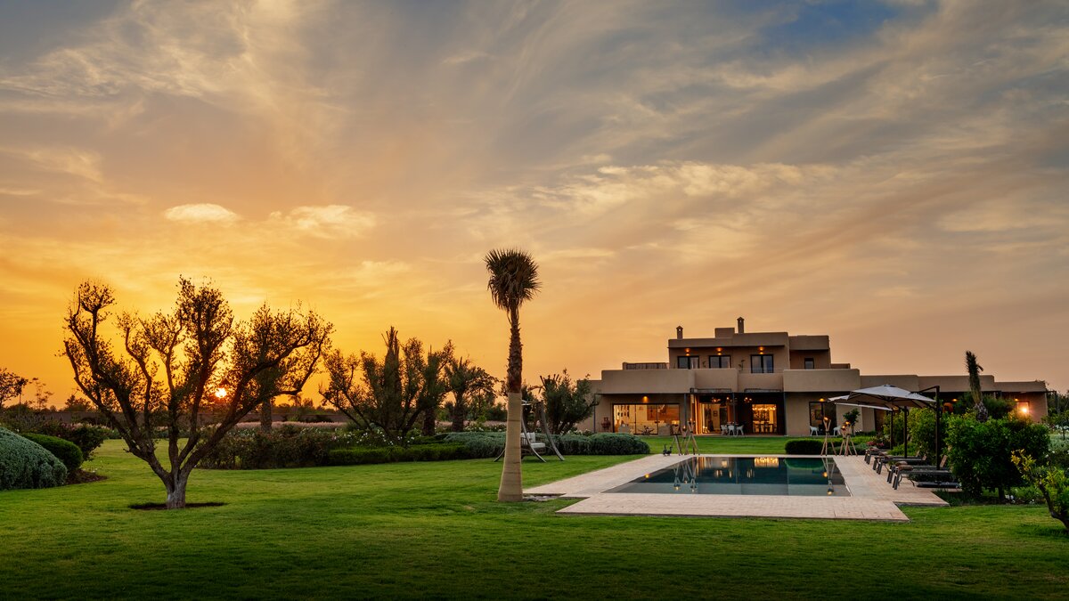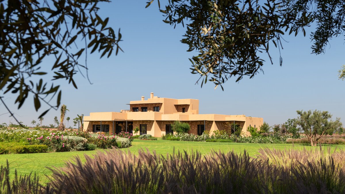 Dar Jannah ist eine luxuriöse Villa mit fünf Schlafzimmern inmitten eines drei Hektar großen Landschaftsgärten in Marrakesch, Marokko, mit einer Krocket-Wiese und einem Acryl-Tennisplatz.