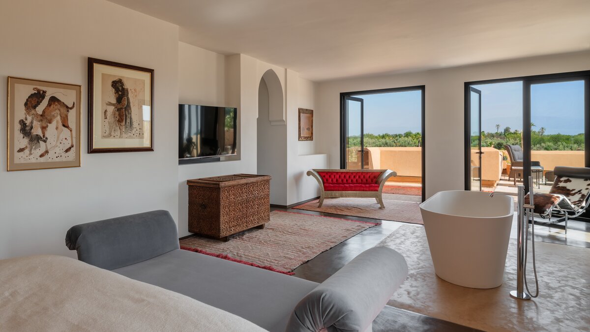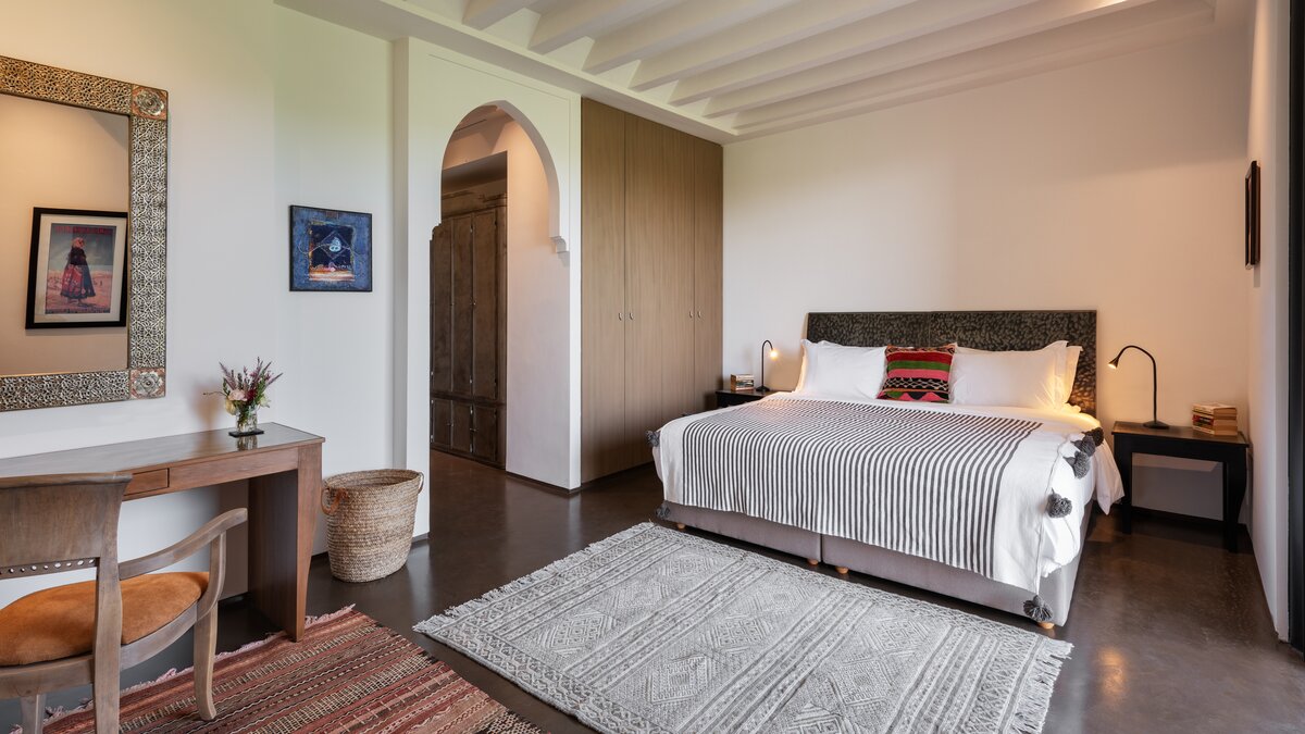 Die Villa wurde im Jahr 2024 neu erbaut und in Betrieb genommen und ist modern, hell und luftig mit hochwertigen Kunstwerken geschmückt. Im Erdgeschoss befindet sich ein großer OFFENER GRUNDRISS Wohn- und Essbereich, der sich direkt auf die Gärten öffnet und den perfekten gesellschaftlichen Raum bietet, um die Gäste den ganzen Abend lang zu unterhalten. In der Küche können die Gäste das Gute aus der ausgezeichneten Berberköchin der Villa, Meryem, machen, die oft köstliches hausgemachtes Gebäck für die Gäste der Villa backt, die auf Anfrage exquisite marokkanische 3-Gänge-Abendessen zubereiten können. Denen Gäste können auch täglich ein kostenloses kontinentales Frühstück mit hausgemachten Berberbroten, Pfannkuchen und Marmeladen genießen. Vier komfortable Schlafzimmer mit eigenen Terrassen, die sich zum Garten hin öffnen, vervollständigen das Erdgeschoss, jedes mit einem Duschbad en suite und hypoallergener Seidenbettwäsche. Im ersten Stock befindet sich das Hauptschlafzimmer mit einer einladenden Badewanne im Zimmer, neben einem Duschbad en suite, das sich auf eine Terrasse öffnet. Abgerundet wird das Interieur der Villa durch das untere Erdgeschoss mit einem entspannenden Hamam und TV-Raum. Denen Gäste des Dar Jannah können auch vollklimatisierte Räume nutzen.
