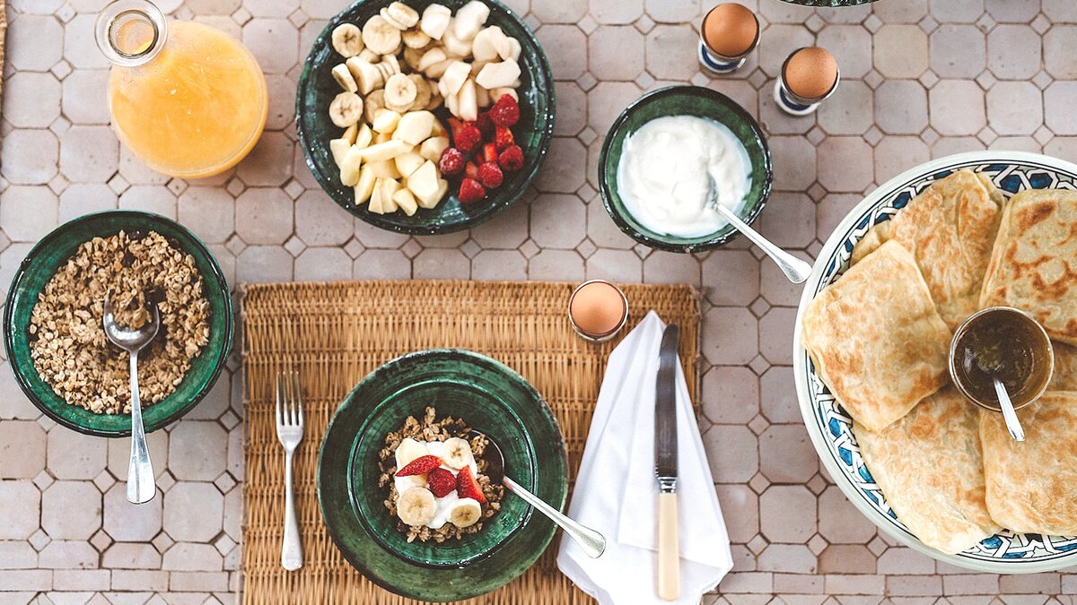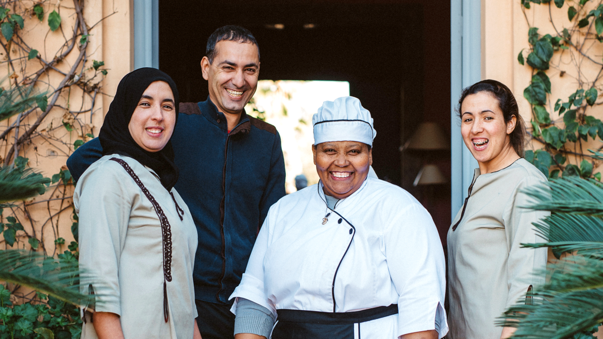 Die Gäste werden vom Team der Villa (Koch und Hausmädchen) betreut und die Villa steht nicht zur Selbstverpflegung zur Verfügung. Deren Küche ist komplett für die Nutzung durch das Personal ausgestattet und die Gäste können die Küche nutzen, um Medikamente und Kindernahrung bei Bedarf zu lagern. Frühstück ist im Preis inbegriffen. Deren Kosten für das Mittagessen betragen MAD 200 pro Person (£ 16) für 2 Gänge und das Abendessen und MAD 275 (£ 22) pro Person für 3 Gänge (50% Ermäßigung für Kinder unter 10 Jahren, Kinder unter 2 Jahren sind kostenfrei). Wasser und eine Auswahl an alkoholfreien Getränken und Weinen sind erhältlich und vor Ort zu bezahlen.