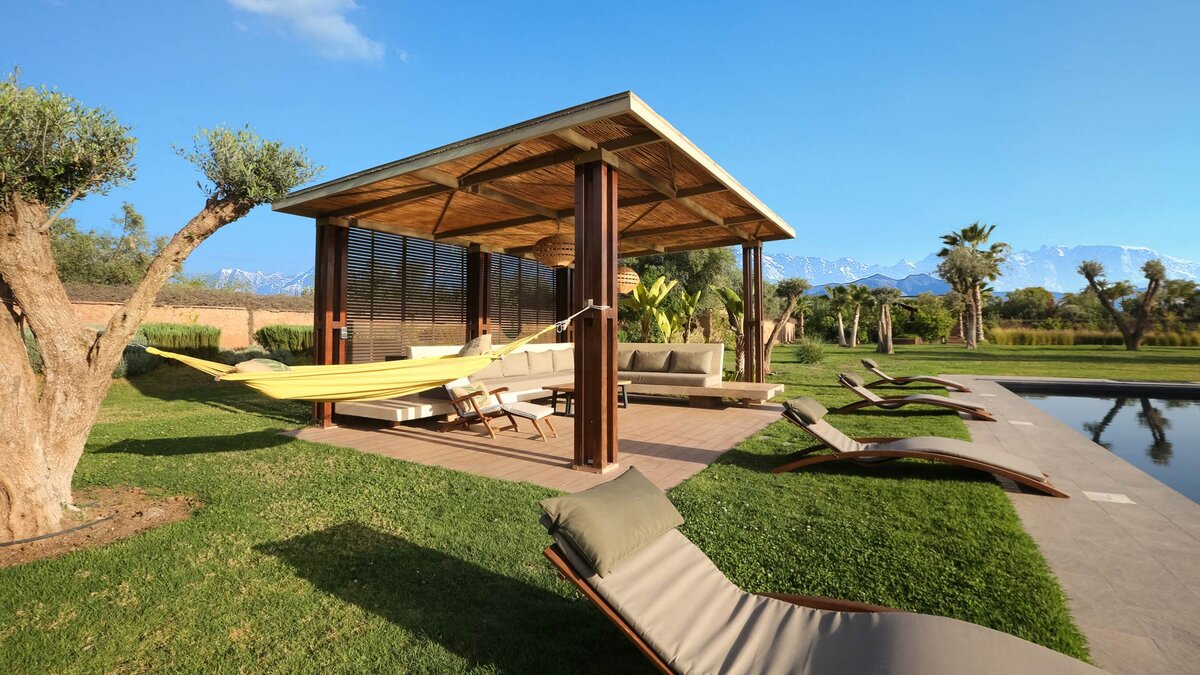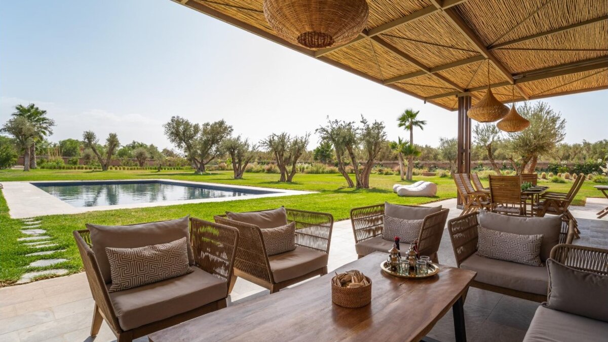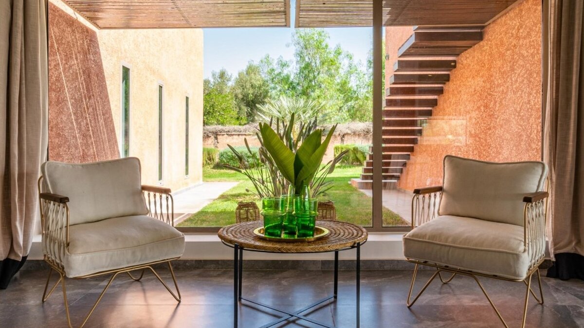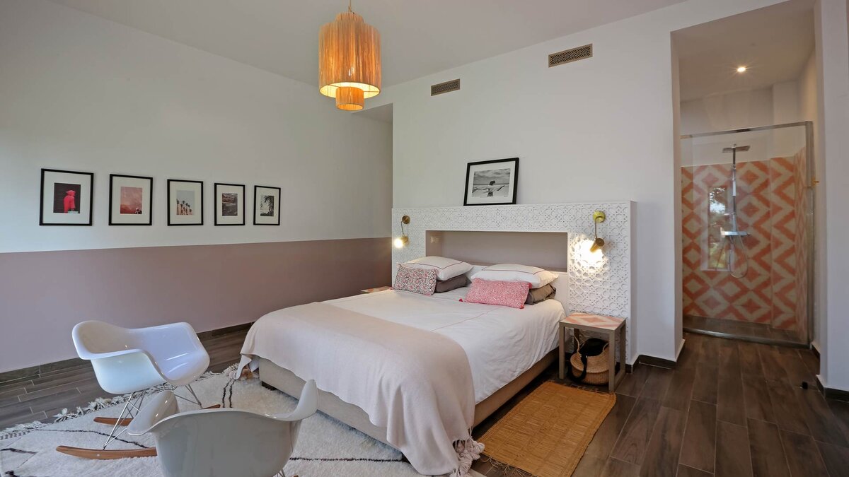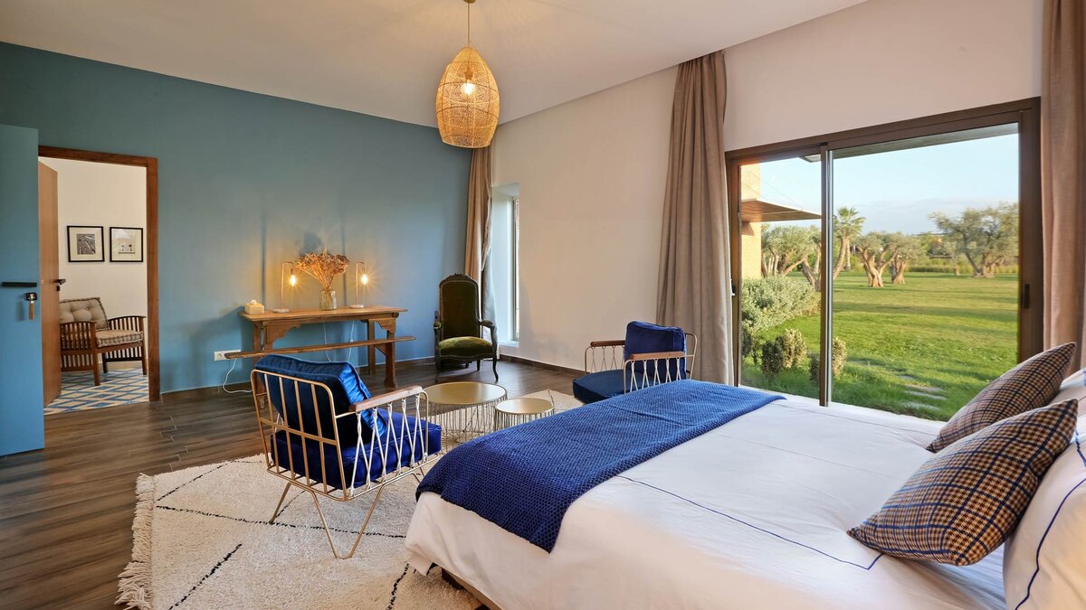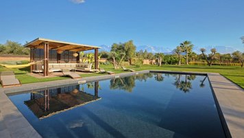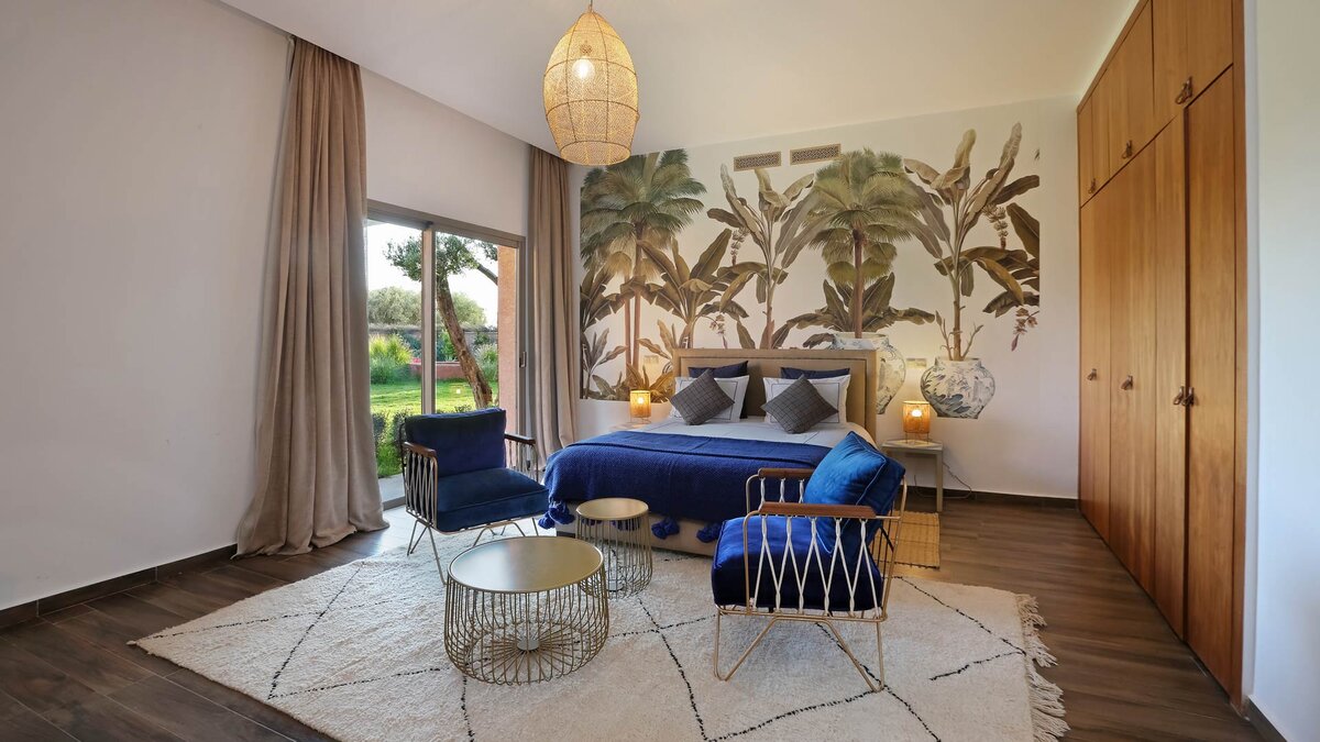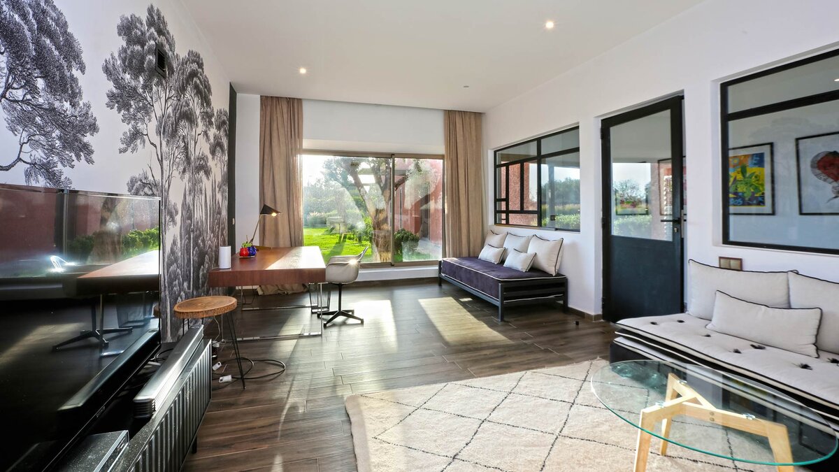 Im Haupthaus gibt es vier geräumige und schön eingerichtete Schlafzimmer, darunter die Master-Suite mit freistehender Badewanne; Die Canvas-Lodge bietet weitere Unterkünfte für vier Personen, darunter ein Schlafzimmer mit Doppelbett und ein Schlafzimmer mit Etagenbett, das ideal für Kinder ist. Der Canvas-Lodge, die sich in der südöstlichen Ecke des Geländes befindet, ist ein einzigartiges Angebot, das es den Gästen ermöglicht, in die Natur einzutauchen. Auf dem Gelände gibt es einen Sand-Boule-Platz, Tischtennis und einen Kinoraum, während die ausgezeichneten Restaurants und Einkaufsmöglichkeiten von Marrakesch nur 15 Minuten entfernt sind.