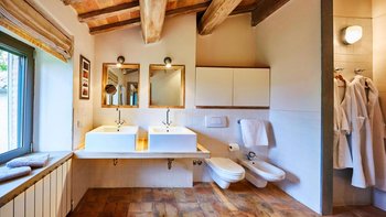 Für einen wirklich erholsamen Aufenthalt auf dem Land wäre eine geräumigere, elegante und gepflegte Villa schwer zu finden. Casale del Sole ist ein Ort für alle Jahreszeiten und verfügt über weitläufige Gärten, Terrassen im Freien und einen Pool, in dem man wirklich schwimmen kann. Für die kühleren Monate gibt es bequeme Sofas und einen großen offenen Kamin im Wohnzimmer; und Tischtennis und Tischfußball im Spielzimmer. Dessen altes Steinhaus, ein eher erwachsenes Refugium, wurde mit Flair und Stil restauriert und unter den Holzbalkendecken eine sehr moderne Inneneinrichtung geschaffen.