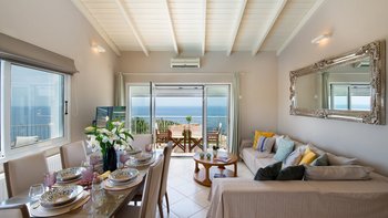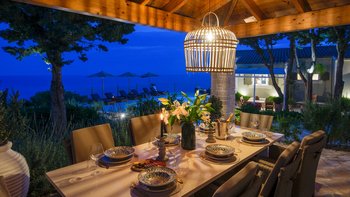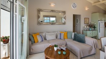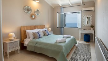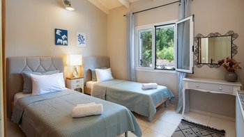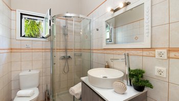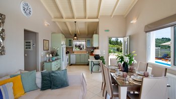 Das moderne Interieur der Villa bietet den Gästen eine warme und einladende Atmosphäre. Der offene Wohnbereich verfügt über ein komfortables Wohnzimmer mit einem großen Fernseher und Balkontüren, die einen atemberaubenden Blick auf das Meer rahmen. Der Essbereich schließt sich nahtlos an den Wohnbereich an und ist ideal für intime Zusammenkünfte. Drei gut ausgestattete Schlafzimmer sind für Familien und Paare gleichermaßen geeignet, wobei das Haupt- und das Doppelschlafzimmer einen bezaubernden Meerblick bieten, während das Zweibettschlafzimmer den üppigen Garten überblickt. Zwei Gemeinschaftsduschen vervollständigen das Interieur der Villa.