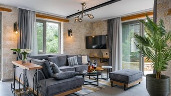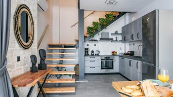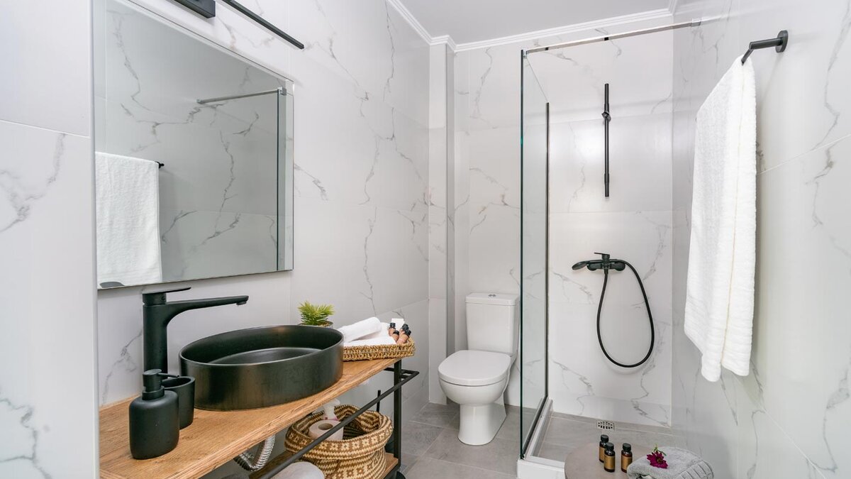 Im Erdgeschoss erwartet die Gäste ein großzügiger, offener Wohnbereich, in dem Designer-Glas-Pendelleuchten einen modernen Essbereich beleuchten, der nahtlos in eine voll ausgestattete Küche übergeht. Dessen Plüsch-Grau-Sofa lädt zum Entspannen im Wohnbereich ein, der direkt auf eine sonnenverwöhnte Terrasse mit eleganten Sitzgelegenheiten und faszinierendem Meerblick führt. Ebenfalls auf dieser Ebene befindet sich ein stilvolles Bad mit ebenerdiger Dusche.