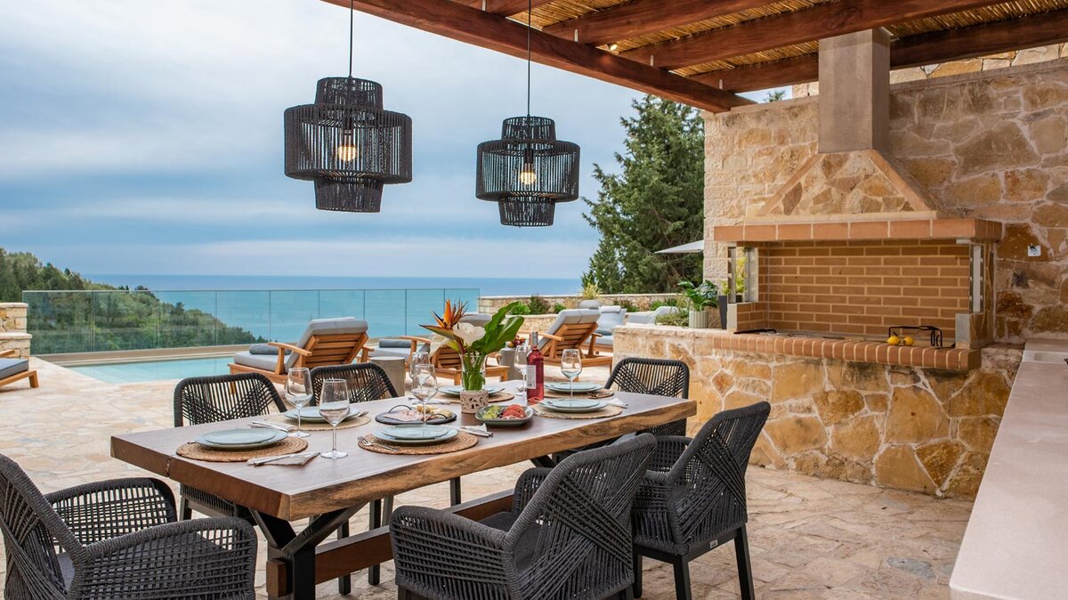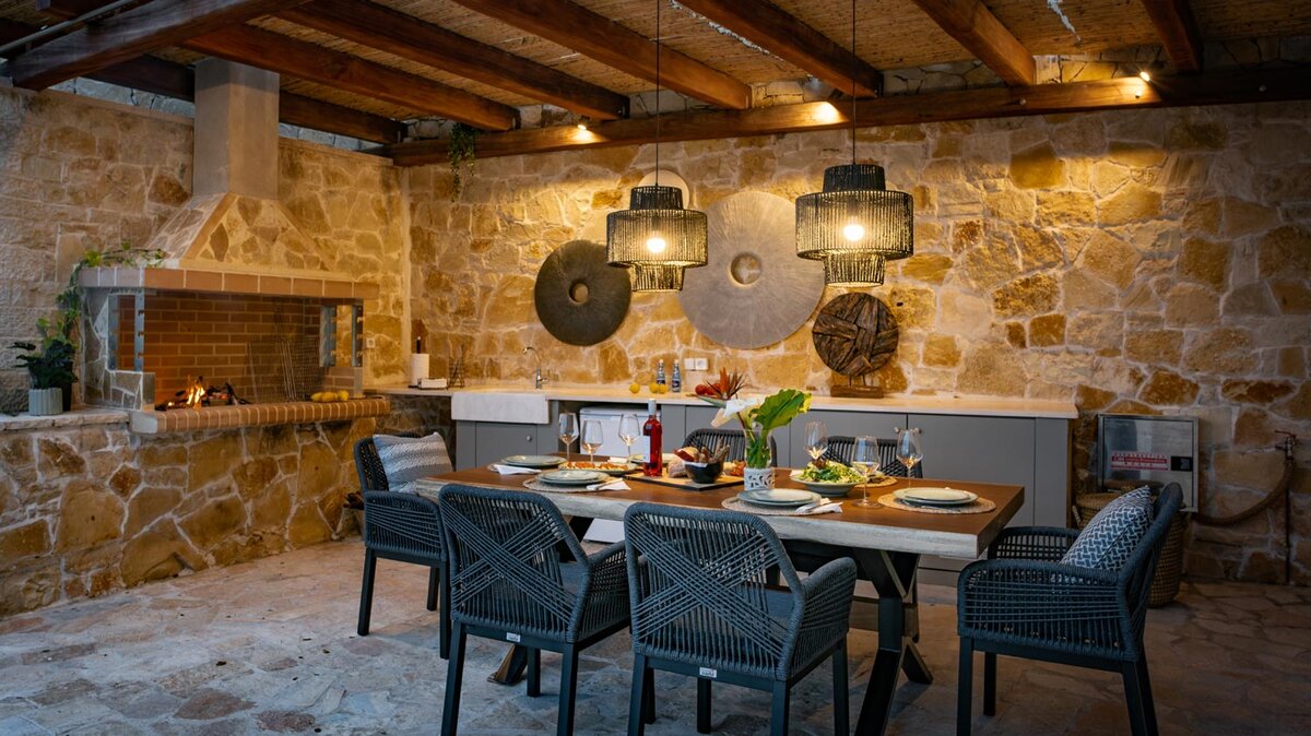 Die Außenbereiche der Villa sind für Genuss und Entspannung konzipiert und konzentrieren sich auf einen privaten Infinity-Pool, der von hochwertigen Liegen umgeben ist. Mehreren Terrassen bieten Restaurants im Freien und ruhige Plätze für ruhige Kontemplation, während eine überdachte Außenküche und ein Essbereich mit eleganten Steinmauern und Ambientebeleuchtung die perfekte Bühne für unvergessliche abendliche Zusammenkünfte bilden. Eine Außendusche und eine üppig angelegte Gartenanlage werten die wunderschöne mediterrane Umgebung noch weiter auf.