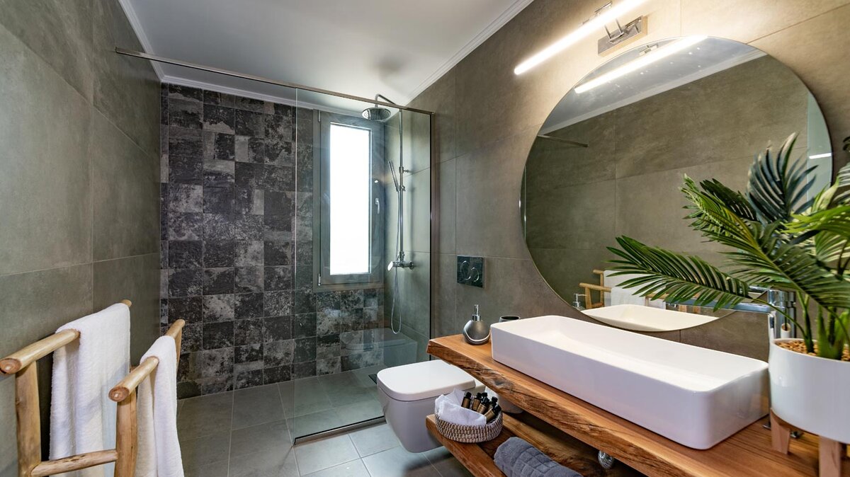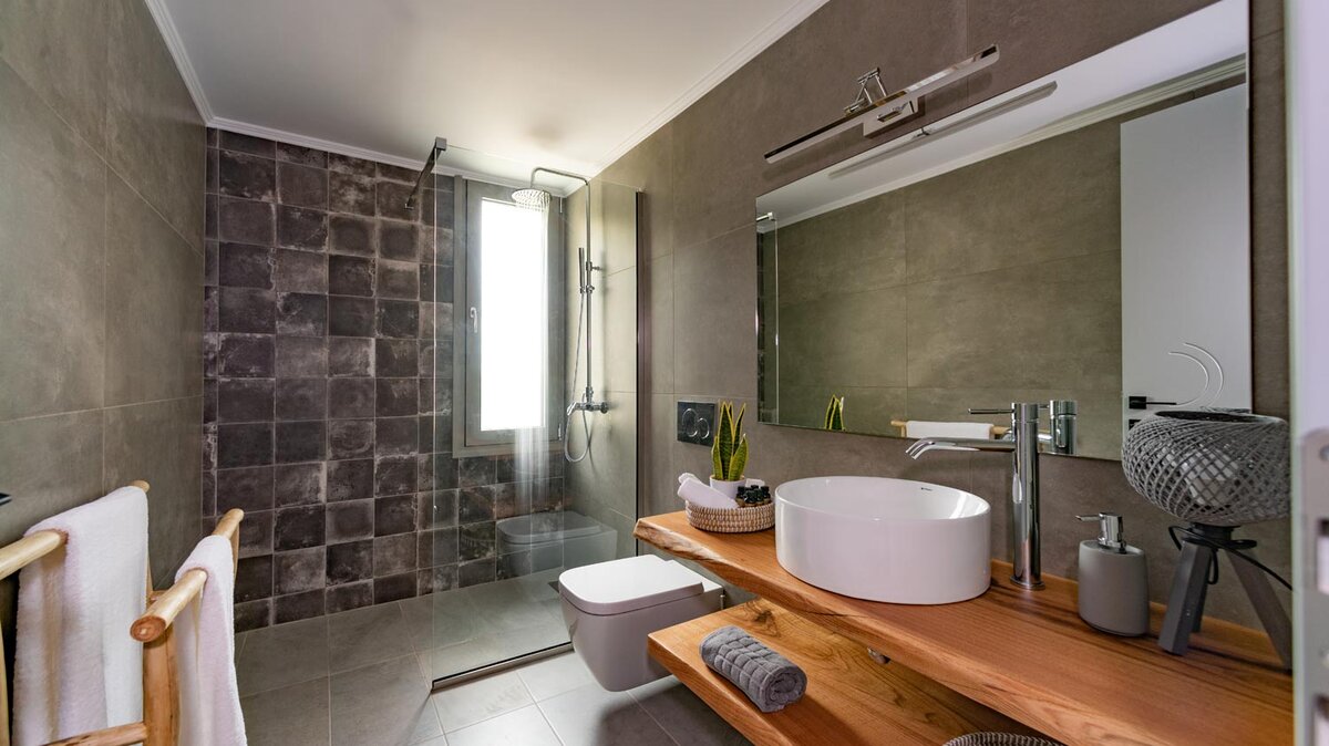 Die obere Ebene beherbergt zwei wunderschön eingerichtete Hauptschlafzimmer, jedes mit luxuriösen Kingsize-Betten und Zugang zu privaten Balkonen, die einen unvergesslichen Blick auf das Mittelmeer bieten. Ein Schlafzimmer verfügt über ein eigenes Bad, während beide mit Designerbeleuchtung geschmückt sind und viel Tageslicht genießen, was einen beruhigenden Rückzugsort zum Ausruhen schafft. Ein zweites modernes Badezimmer mit modernen Armaturen befindet sich auf dieser Etage und sorgt für Bequemlichkeit für alle Gäste.