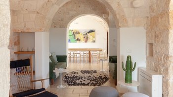 Die Innenräume verbinden traditionellen Charakter mit zeitgemäßem Design. Gewölbte Steindecken und freiliegende Wände schaffen Atmosphäre, während moderne Möbel für Komfort sorgen.