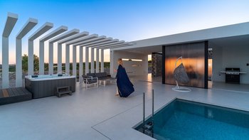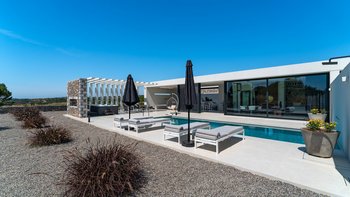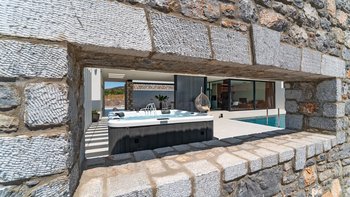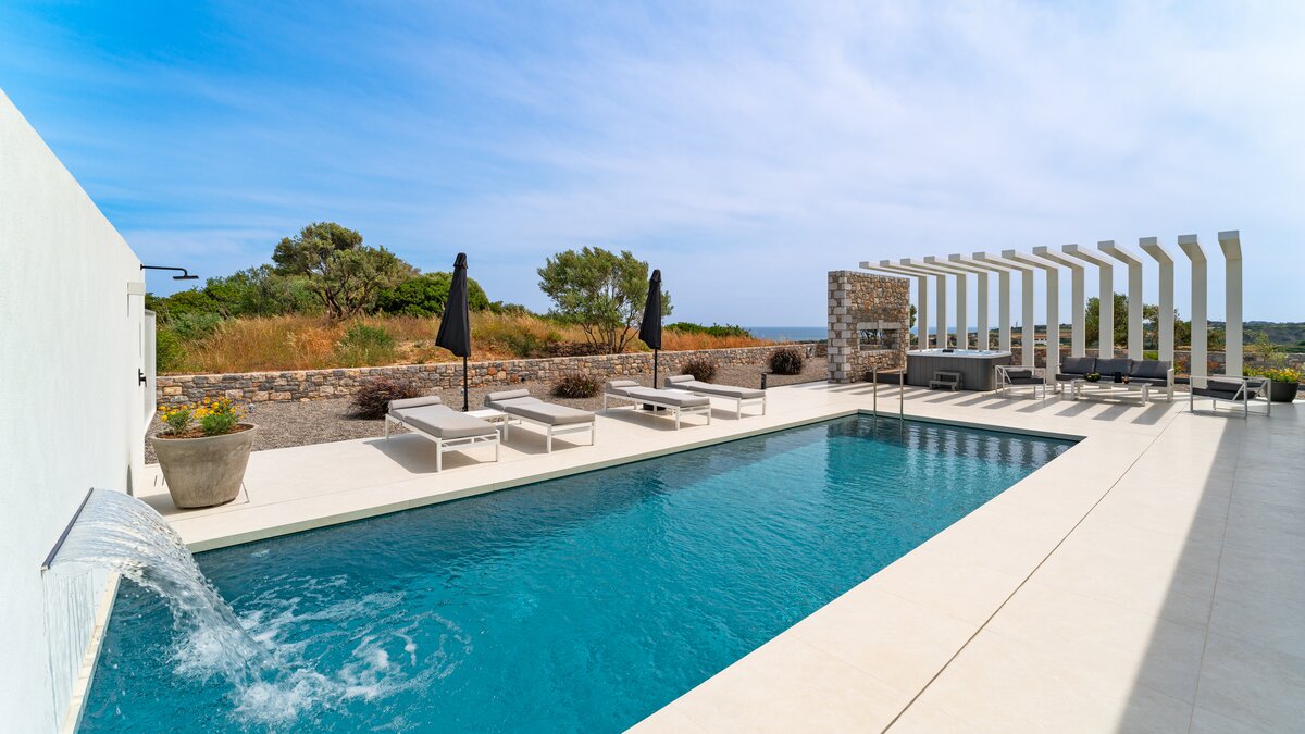 Perfekt als romantischer Rückzugsort für zwei Personen, Rodos Blu ist eine moderne Villa mit stilvollem Interieur, herrlicher Aussicht und einem eigenen beheizten Jacuzzi.