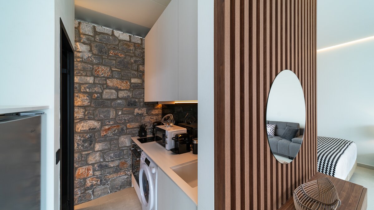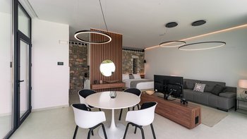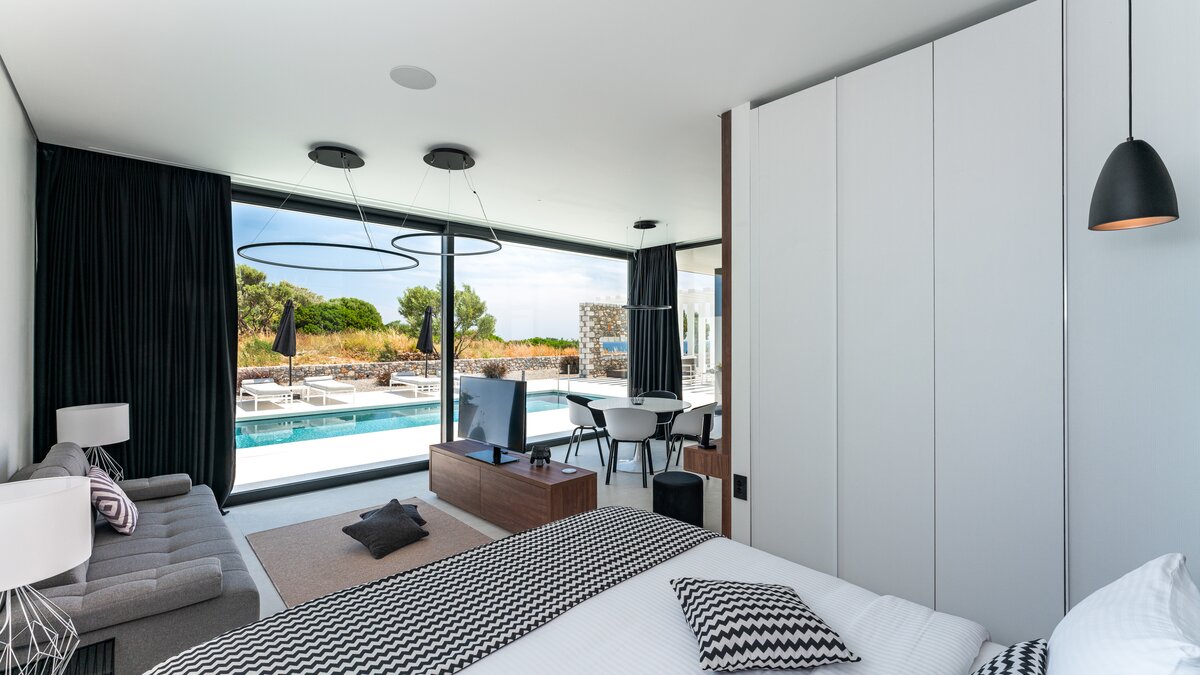 Rodos Blu ist eine atemberaubende Villa mit einem Schlafzimmer, die speziell für Paare entworfen wurde, die eine romantische Flucht nach Rhodos suchen. Deren Villa verfügt über ein Kingsize-Bett, eine voll ausgestattete Küche und ein einzigartig gestaltetes Bad mit raumhohen Glaspaneelen. Im selben Raum befindet sich ein Ess- und Wohnbereich mit einem großen Fernseher mit Netflix und PlayStation. Was diese Villa so einzigartig macht, sind die großen Glasfenster, die einen ungestörten Blick auf die Umgebung und die Poolterrasse bieten.