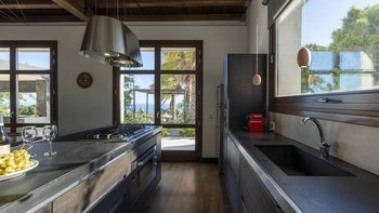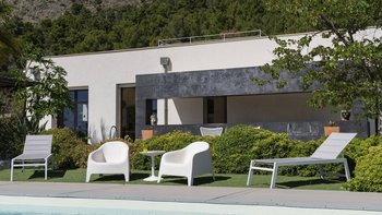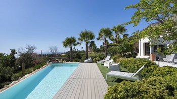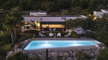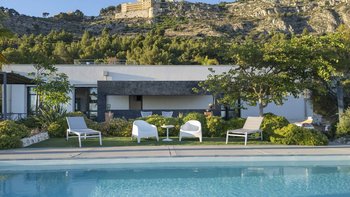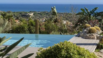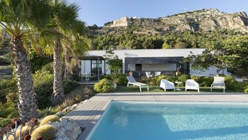 Dieses moderne, von Architekten entworfene Haus liegt in einem Hügel mit Blick auf einen herrlichen und selten besuchten Abschnitt der südlich ausgerichteten Mittelmeerküste. Der wahre Anziehungspunkt dieser Immobilie ist der Außenbereich, mit einer großen gepflasterten Terrasse vor dem Haus, die hinunter zum atemberaubenden privaten Infinity-Pool führt, beide perfekt gelegen, um die unglaubliche Aussicht auf die Küste und das Meer zu genießen. Denen Terrasse, die den Pool umgibt, ist der ideale Ort, um auf einer Sonnenliege mit einem Glas Wein in der Hand zu entspannen. Hübsche mediterrane Gärten flankieren das Anwesen, Rosmarin und Lavendel duften die Luft. Im Zwischengeschoss befindet sich eine zweite teilweise schattige Terrasse, die mit duftenden Sträuchern bepflanzt ist, mit einem Essbereich im Freien und einem Grill, und es gibt auch eine hübsch geflieste Dachterrasse für Panorama-Drinks am Abend.