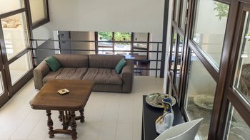 • Zwischengeschoss mit Sitzgelegenheit mit Blick auf das Wohnzimmer und Öffnung zur möblierten schattigen Terrasse auf der oberen Ebene