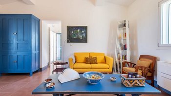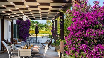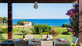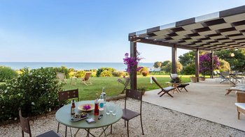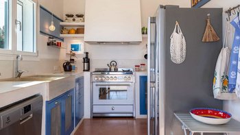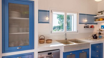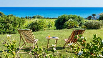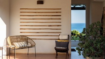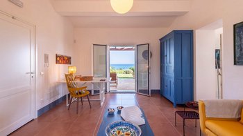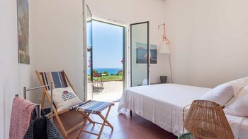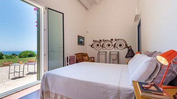 Die Innenräume der Villa strahlen Wärme und Eleganz aus und verbinden ein Boho-Chic-Dekor mit natürlichen Materialien wie Holz und Stein. Die helle und luftige Villa Belice verfügt über drei geräumige Schlafzimmer, jedes mit Meerblick und französischen Türen, die sich direkt zum Garten öffnen. Der Wohnbereich ist gemütlich und stilvoll, mit farbenfrohen Stoffen und Vintage-Designelementen geschmückt. Eine voll ausgestattete Küche mit modernen Geräten wie Geschirrspüler und Elektroherd sorgt für Komfort.