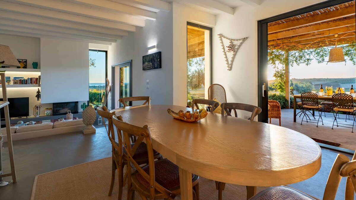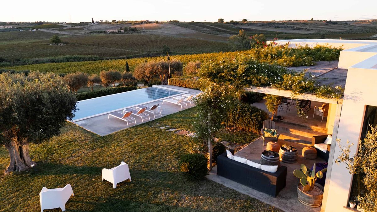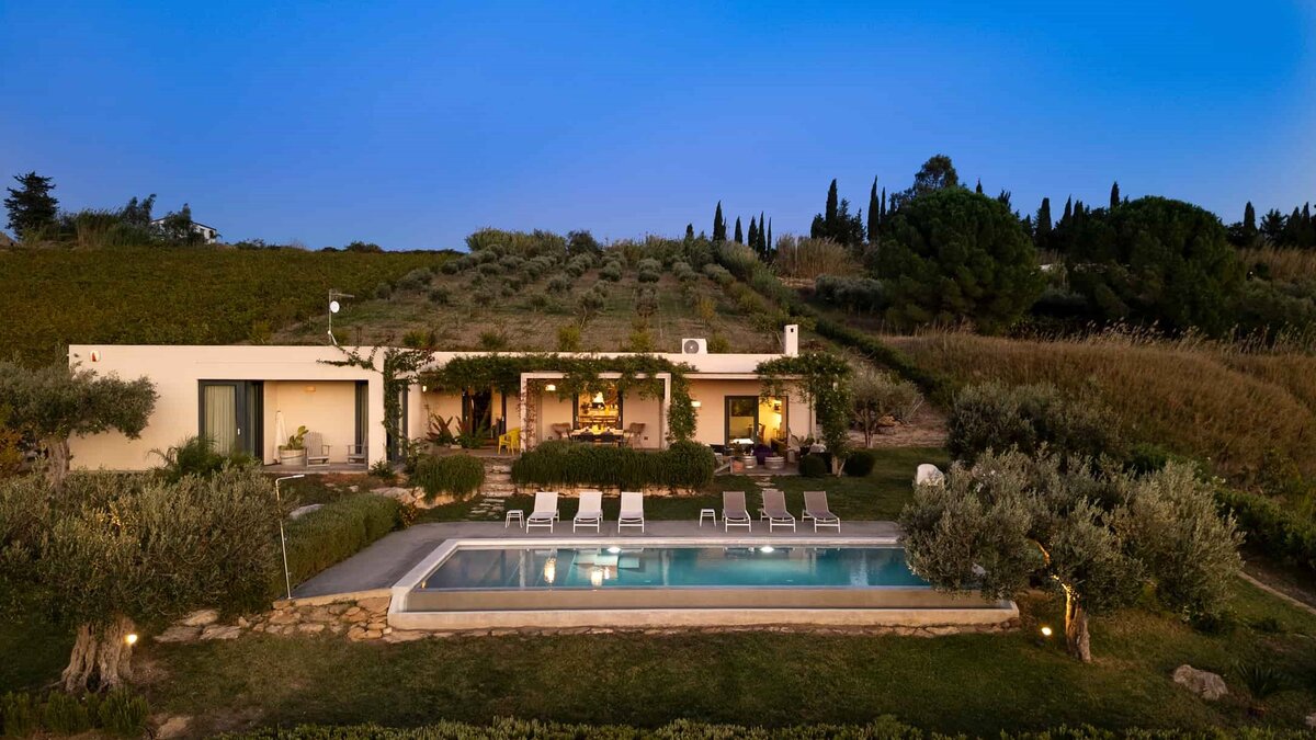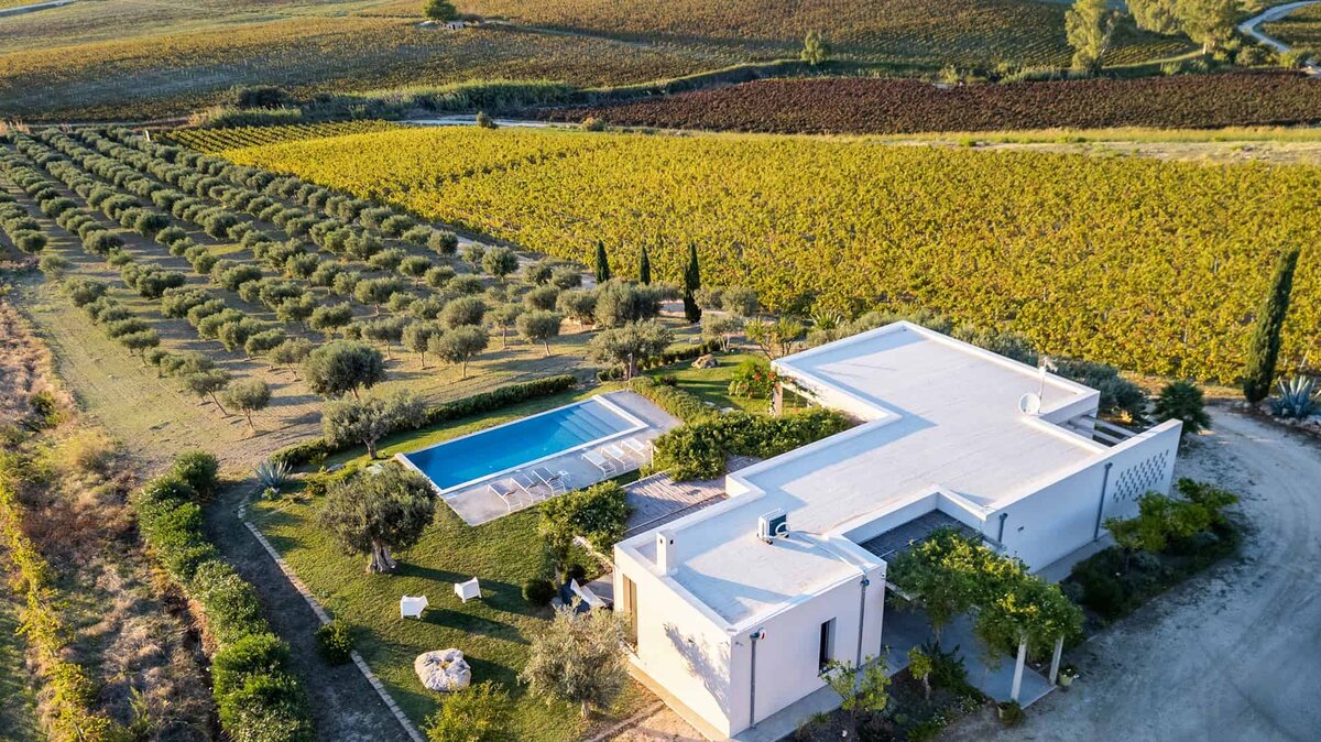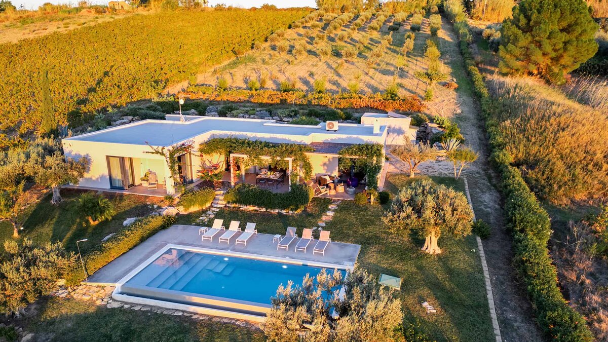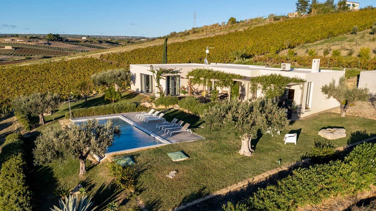 Umgeben von langen Reihen von Weinbergen und Olivenbäumen genießt die Villa La Solette eine unverwechselbare Lage in der Landschaft von Menfi und bietet eine raffinierte Mischung aus modernem Komfort und klassischem mediterranem Stil.