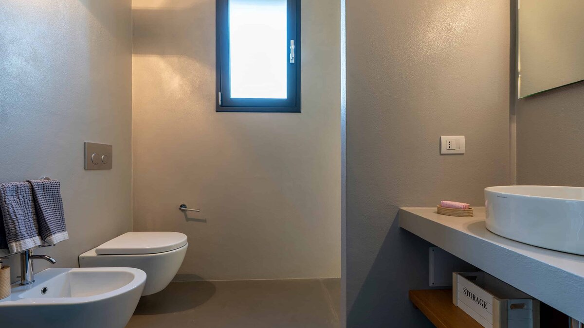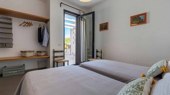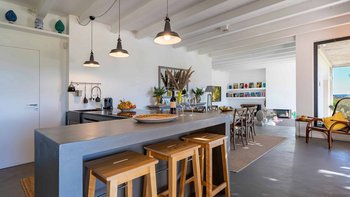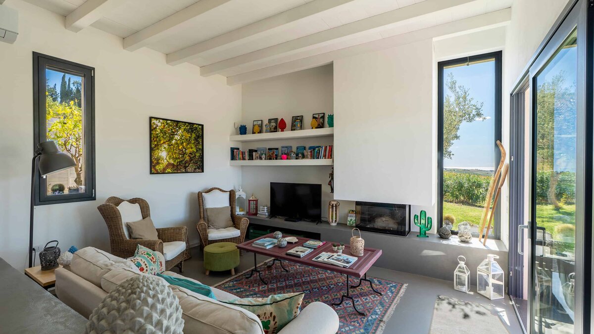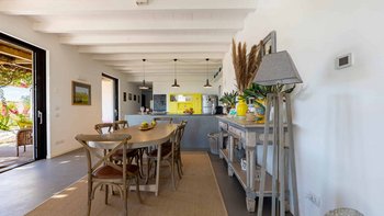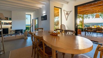 Die Villa ist auf einer Ebene gestaltet und öffnet sich in einen hellen und einladenden offenen Wohnbereich mit einem gemütlichen Wohnzimmer mit Sofas und Sesseln, die um einen modernen Kamin angeordnet sind. Ein paar Stufen führen hinauf zum stilvollen Essbereich und der gut ausgestatteten Küche, die wunderschön von einer eleganten zentralen Halbinsel mit Induktionskochfeld definiert wird, wo polierte Betonböden, freiliegende Balkendecken und weitläufige Glastüren ein lichtdurchflutetes und geräumiges Ambiente schaffen, während sie nahtlosen Zugang zur Hauptterrasse und einen weiten Blick über die Landschaft bieten. Ein Flur führt zu den ruhigen Schlafbereichen, die drei gut ausgestattete Schlafzimmer umfassen: ein Haupt-Doppelzimmer mit eigenem Duschbad und direktem Zugang zur Poolterrasse, ein zweites Schlafzimmer mit herrlichem Blick und Türen, die zur Hauptterrasse und zum Poolbereich führen, und ein flexibles Doppel- oder Zweibettzimmer mit Zugang zu einer ruhigeren, schattigen Terrasse, was die Villa ideal für Familien oder kleine Gruppen von Freunden macht.