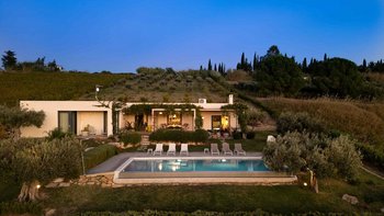 Das Leben im Freien befindet sich auf der großzügigen vorderen Terrasse, die sich perfekt zum Sonnenbaden, Entspannen oder Essen im Freien eignet, während man den weiten Blick über die Weinberge bis hin zum schimmernden Meer genießt, das bei Sonnenuntergang besonders bezaubernd ist. Eine große überdachte Veranda, die sowohl vom Wohn- und auch vom Essbereich aus zugänglich ist, bietet einen schattigen Rückzugsort mit einer eleganten Außenlounge und einem Esstisch, ideal für gemütliche Mahlzeiten und abendliche Aperitifs. Stufen führen hinunter zum atemberaubenden Infinity-Pool, der zwischen dem üppigen Grünen und dem blauen Horizont dahinter zu schweben scheint, direkt zum Meer blickt und das Herz des Outdoor-Erlebnisses der Villa bildet.