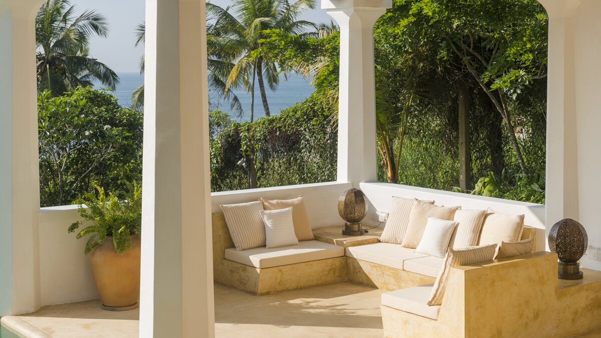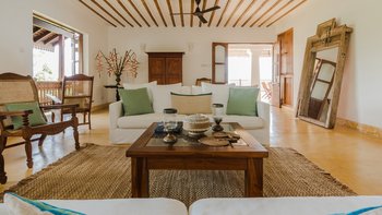 Im Inneren bietet die Villa ein schickes, luftiges Interieur, das sri-lankische Antiquitäten nahtlos mit indischen Stoffen und lokalen handgewebten Juteteppichen verbindet. Dessen Design, inspiriert von der traditionellen Suaheli-Architektur, schafft eine harmonische Atmosphäre im gesamten Gebäude. Jedes der fünf Schlafzimmer mit eigenem Bad ist großzügig und geschmackvoll eingerichtet, komplett mit einer eigenen Veranda mit einem außergewöhnlichen Blick auf das Meer. Dessen formelles Wohnzimmer strahlt entspannte Eleganz aus und bietet die perfekte Kulisse für entspannte Geselligkeit. Für weitere Entspannung sorgt ein Massageraum am Pool mit Kerzen, Weihrauch und den Dienstleistungen des besten Masseurs der Insel.