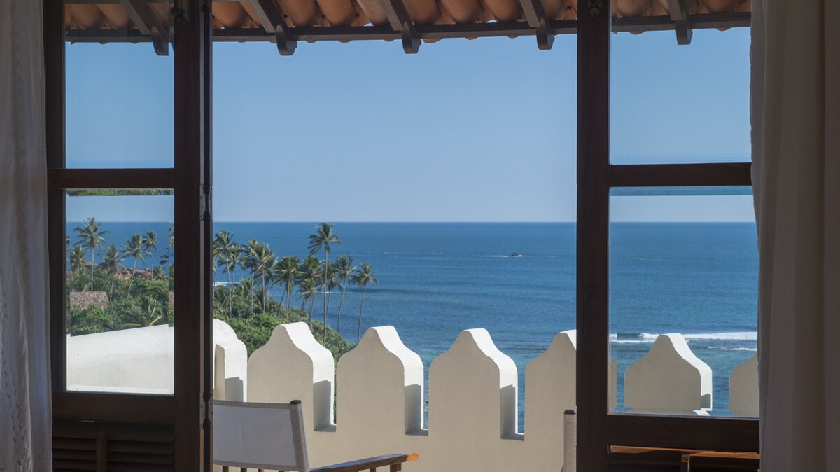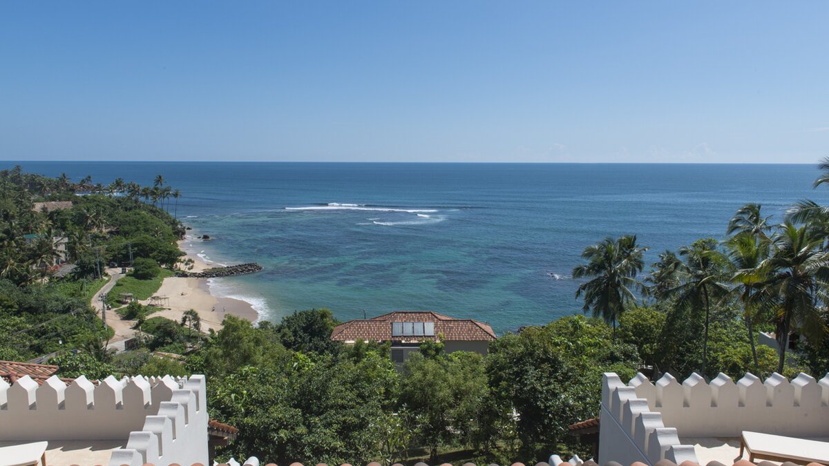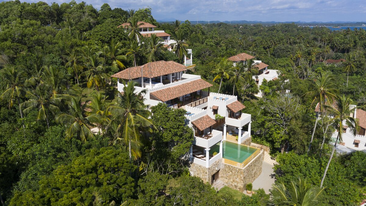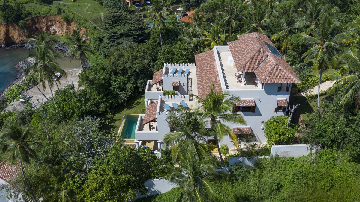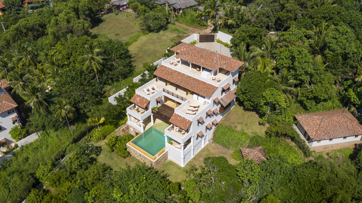 Auf einem ruhigen Hügel an der Südküste Sri Lankas gelegen, ist Chalcedony eine geräumige Villa mit fünf Schlafzimmern und Blick auf den Indischen Ozean inmitten eines ruhigen Meeres mit üppigem Grün.