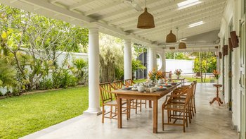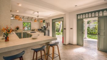 Im Inneren ist die Villa durchgehend hell und luftig, unterstützt durch die OFFENER GRUNDRISS Aufteilung der Wohnbereiche und der Küche. Große französische Fenster blicken auf den Poolbereich zwischen dem Haupthaus und dem Poolhaus und lassen viel natürliches Licht in das Anwesen ein. Der Hauptwohnbereich hat hohe Decken und ist aufwendig mit kleinen Details dekoriert, mit eleganten Mahagoni-Bannistern, die die Gäste bis in den ersten Stock bringen, wo sich jedes der vier geräumigen Schlafzimmer des Haupthauses befindet. Jedes Schlafzimmer verfügt über ein eigenes Bad, während das Hauptschlafzimmer en suite mit einer begehbaren Doppeldusche, zwei Waschtischen und einer separaten Toilette abgeschirmt ist, um den Gästen den größtmöglichen Komfort zu bieten. Das Poolhaus ist ebenfalls sehr geräumig und verfügt über eine OFFENER GRUNDRISS Küche und einen Wohnbereich. Jedes der beiden geräumigen Schlafzimmer ist mit einem eigenen Bad im Freien mit einer ebenerdigen Dusche verbunden. Frische weiße Wände und schöne pastellgrüne Akzente runden diesen Raum ab.