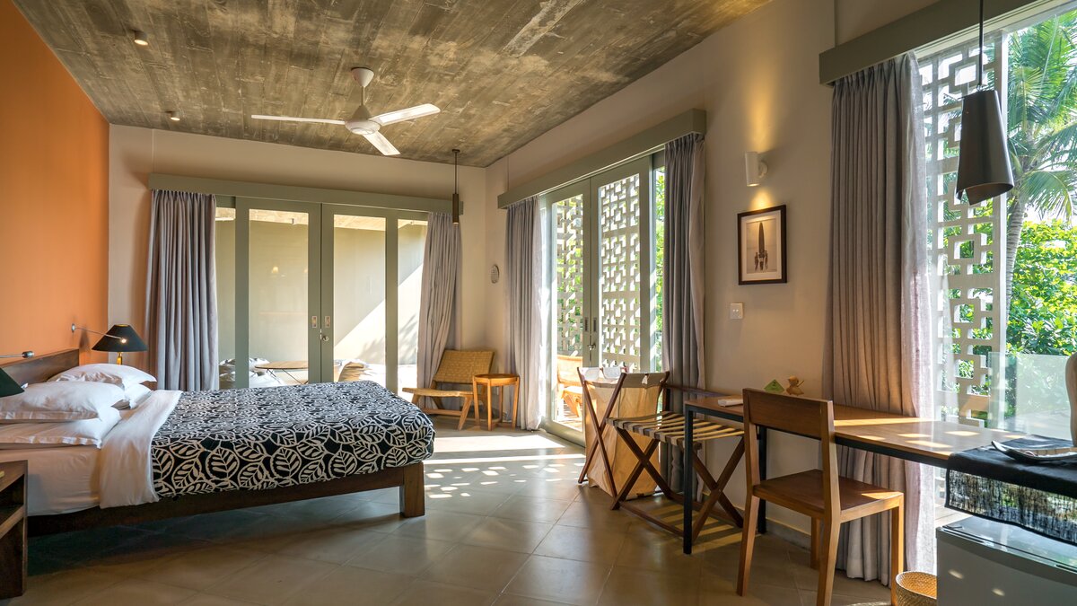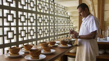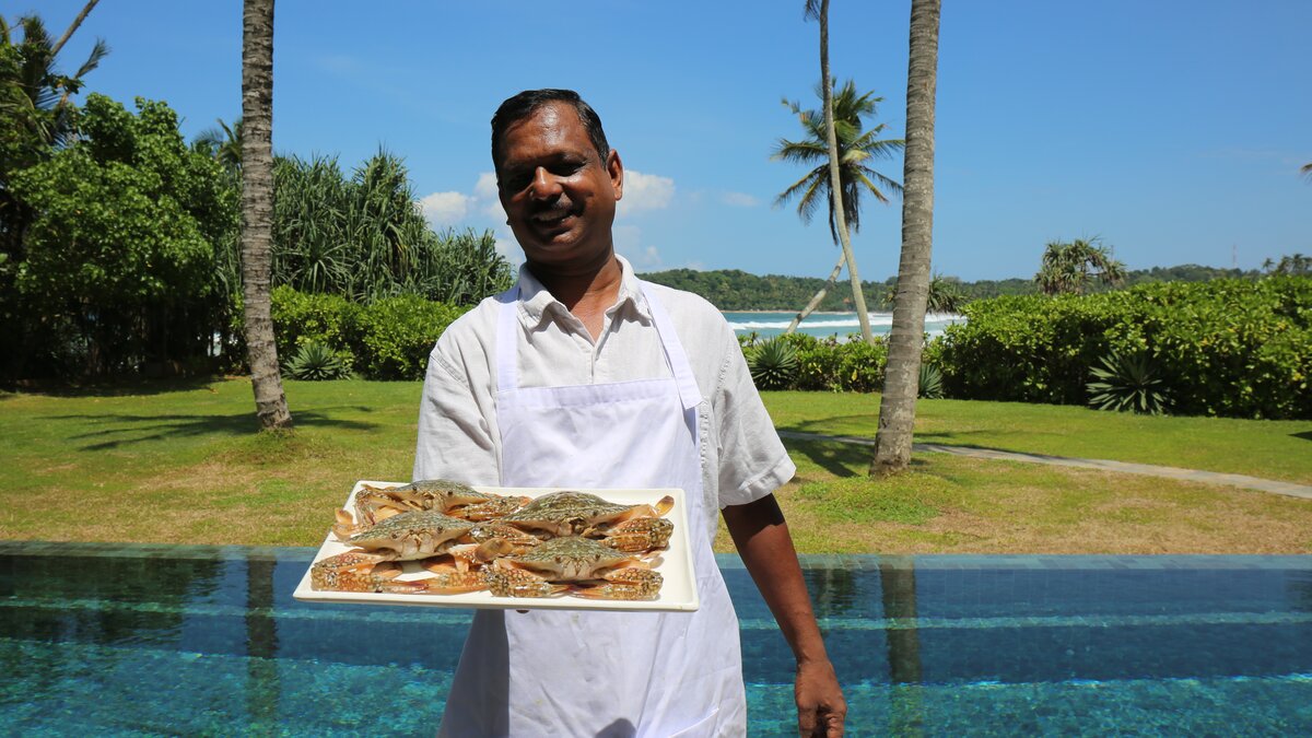 Die Küche ist wirklich das Herzstück der Villa, und hier finden Sie den hochqualifizierten, aber wunderbar bescheidenen Koch. Er engagiert sich sehr dafür, die besten lokalen Produkte zu präsentieren. Er bezieht frisches Gemüse von nahegelegenen Bauern und wählt den Tagesfang von lokalen Märkten oder direkt von den Fischern selbst aus. Jeden Morgen, nachdem er vom Markt mit frischen Meeresfrüchten und saisonalen Zutaten zurückkehrt, pflegt er den eigenen Gemüse- und Kräutergarten der Villa und prüft sorgfältig die Gewürze, die seine Küche inspirieren. Mit seiner langjährigen Erfahrung ist der Küchenchef leidenschaftlich für die sri-lankische Küche und freut sich immer, sein Wissen über die Aromen und Traditionen mit seinen Gästen zu teilen.