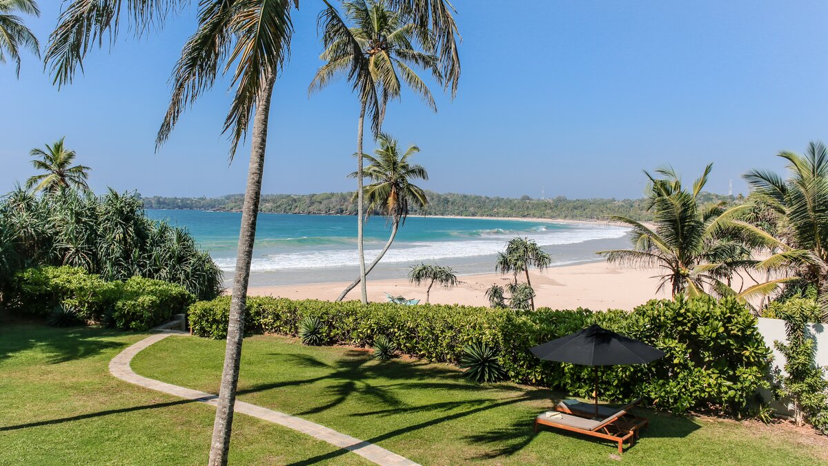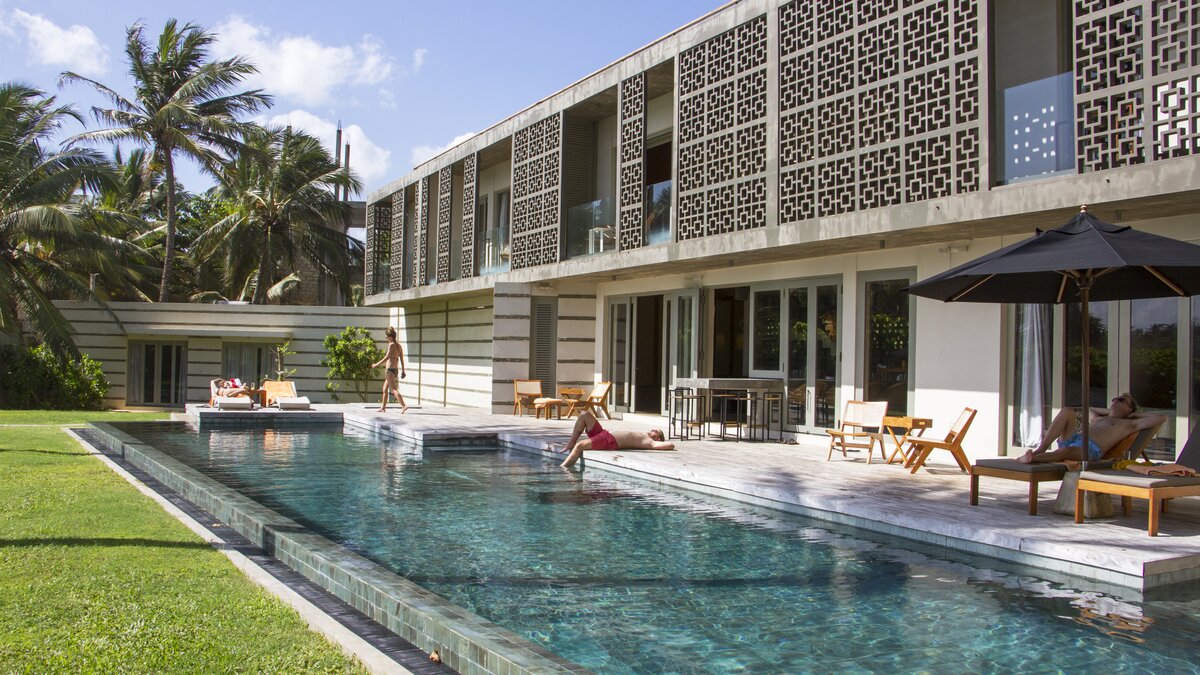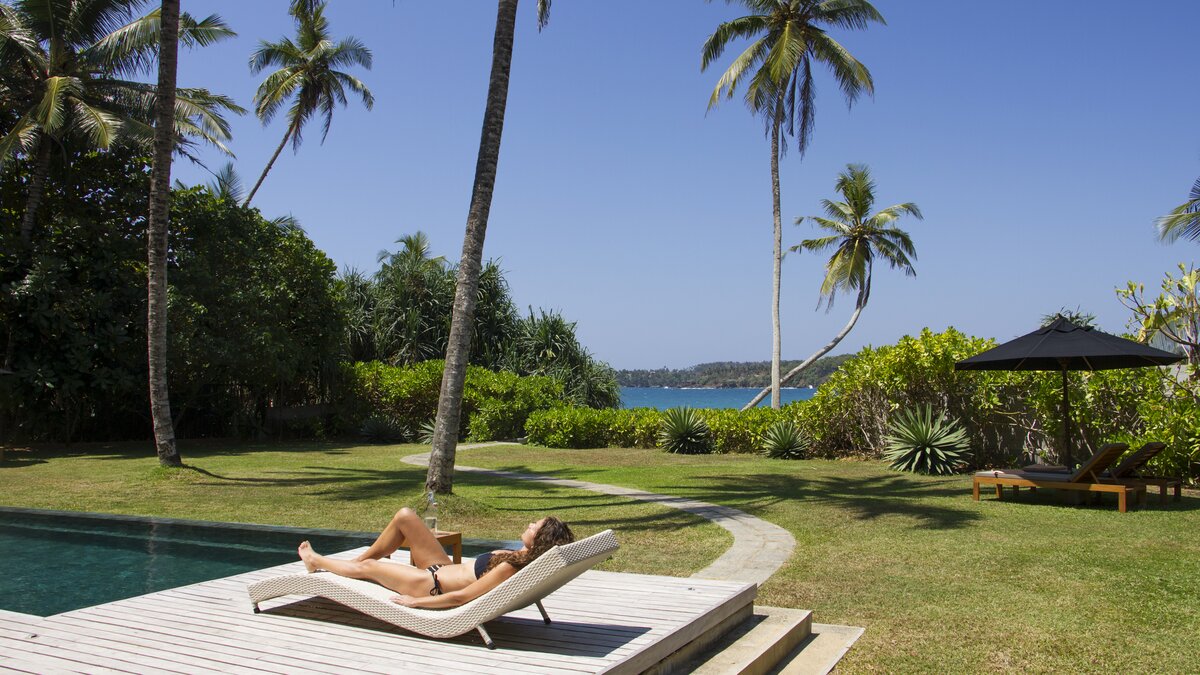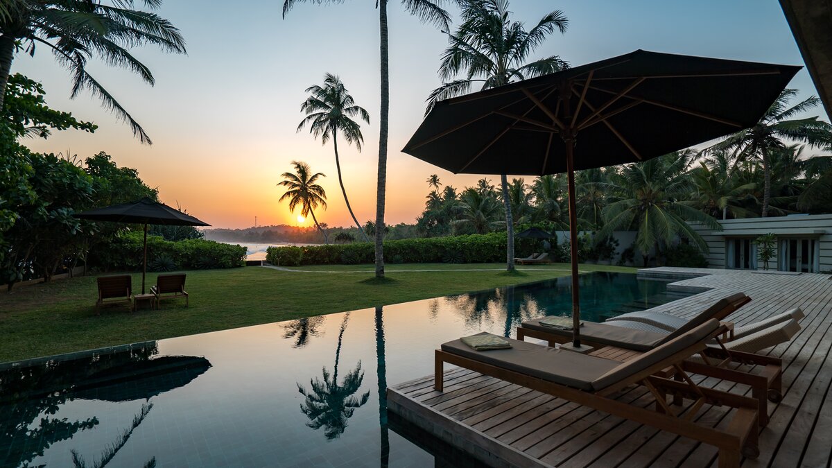 Tamarind Sands ist eine schicke, moderne und ultra-komfortable Villa an der Südküste Sri Lankas. Perfekt am östlichen Rand einer wunderschönen Sandbucht gelegen, haben die Gäste direkten Zugang zum weichen, goldenen Sandstrand darunter, während die Aussicht auf Sonnenaufgang und Sonnenuntergang von der Villa einfach spektakulär ist. Folgen Sie dem Soundtrack des Ozeans durch den Flur, vorbei an der Küche, in der der qualifizierte Koch und sein Team alle Mahlzeiten mit Zutaten von lokalen Bauern und Märkten zubereitenund einschließlich köstlicher Obstplatten und Picknicks am Strand, wenn Sie möchten – und in den offenen Grundriss Wohnbereich. Dieser ist mit superweichen Sitzgelegenheiten für Entspannung im Innenbereich und einem langen Esstisch ausgestattet, der sich auf die Terrasse mit Blick auf den atemberaubenden Indischen Ozean erstreckt. Dessen malerische Terrasse ist mit eleganten Holzliegen und Sonnenschirmen ausgestattet und befindet sich neben dem einladenden Infinity-Pool (mit Kinderbereich), wo Sie die Aussicht über den tropischen Garten genießen können.