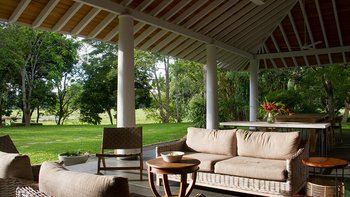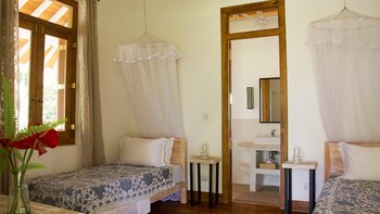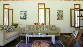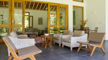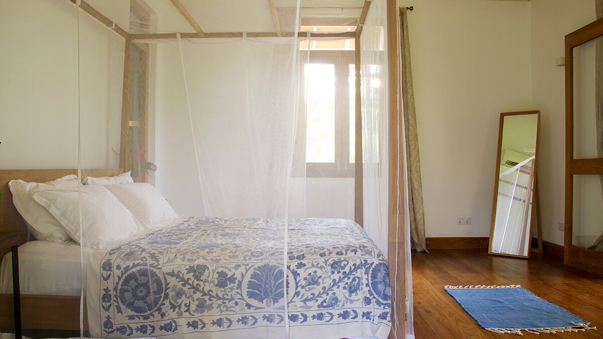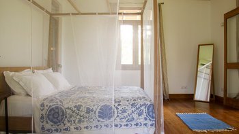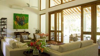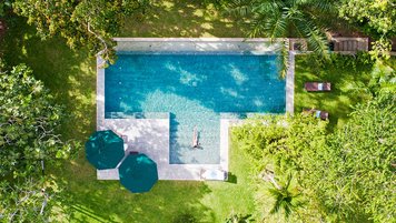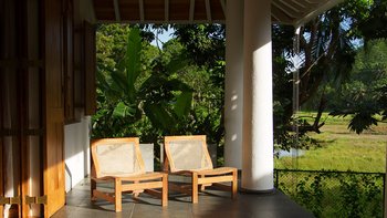 Umgeben von üppigen Reisfeldern, hohen Palmen und wunderschön gepflegten Rasenflächen, ist die Seerose ein magischer Ort, an dem oft Pfauen gesichtet werden, während die Natur von schönen Vogelgesängen und weit entfernten Tempelgesängen begleitet wird. Deren Villa selbst ist stilvoll, modern und makellos eingerichtet, mit Unterkünften in einzigartiger Halbmondform. Sie besteht aus zwei angrenzenden Gebäuden mit einer Veranda, die sich über die gesamte Länge des Anwesens erstreckt und zum Essen und Entspannen im Freien eingerichtet ist. Deren Wohnzimmer ist hell und kühl, mit hohen Decken, farbenfrohen Kunstwerken und bequemen Sitzgelegenheiten. Jenseits des Wohnzimmers befindet sich die voll ausgestattete und gut ausgestattete Arbeitsküche, in der ein wunderbarer Küchenchef alle Mahlzeiten zubereitet – sowohl lokal als auch international – und es erwartet Sie viel köstliches frisches Obst und Gemüse aus dem Garten der Villa. Es gibt ein angrenzendes Marmorbad mit ebenerdiger Dusche, während der gemütliche und komfortable Fernsehraum den Zugang zum Bad teilt und mehrere gepolsterte Sofas bietet. Nebenan befindet sich das erste Schlafzimmer, ein großes, geräumiges Zweibett mit Teakholzboden, zwei Einzelbetten und eigenem Bad. Des zweiten Schlafzimmer ist ein schönes Doppelbett mit einem Safe im eigenen Bad.Ein paar Stufen weiter unten befindet sich das dritte Schlafzimmer und das zweite Zweibett mit zwei Einzelbetten und einem kleinen Bad en suite. Dessen letzte Zimmer ist die Master-Suite, die entweder über den angrenzenden langen begehbaren Kleiderschrank oder über einen eigenen Verandaeingang erreicht werden kann. Es gibt ein Kingsize-Himmelbett mit einem großen Bad en suite mit Doppelwaschbecken, einem Safe und einer Badewanne. Aller Schlafzimmer verfügen über Klimaanlage, Deckenventilatoren und Moskitonetze für maximalen Komfort.